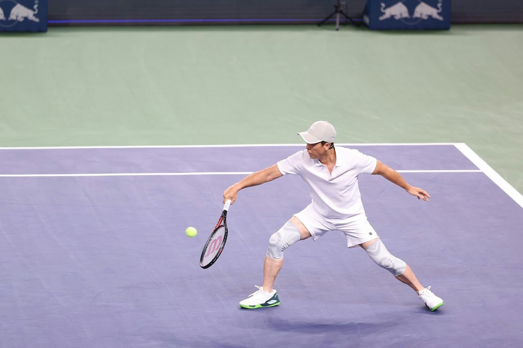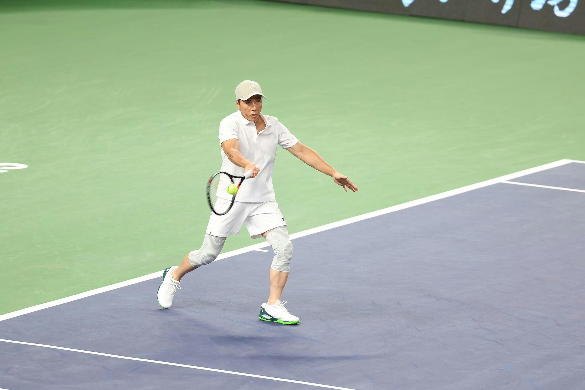 甄子丹參加「費達拿之夜」網球大師賽,與費達拿組隊雙打,對手則為中國網球手鄭潔及演員吳磊。(視覺中國)