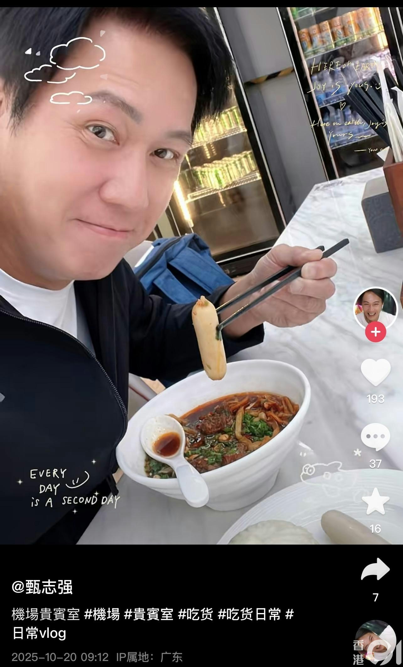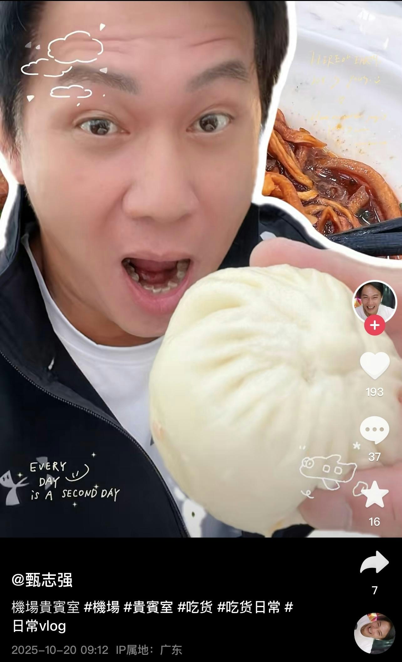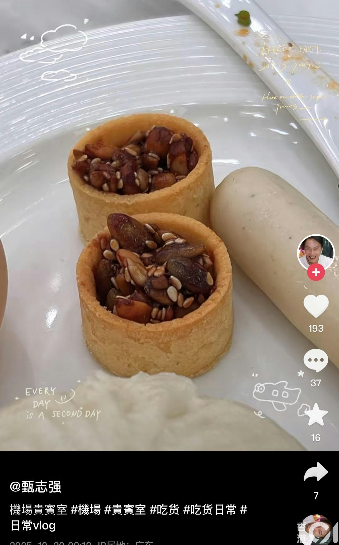 月中(20日)甄志強在抖音發片,分享在深圳機場享受美食。