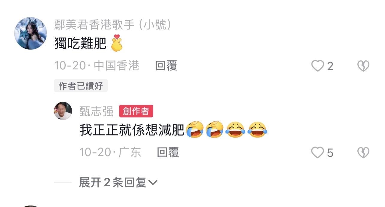 10月20日甄志強在抖音發片,更在留言區回覆鄢美君,笑指自己正在減肥。