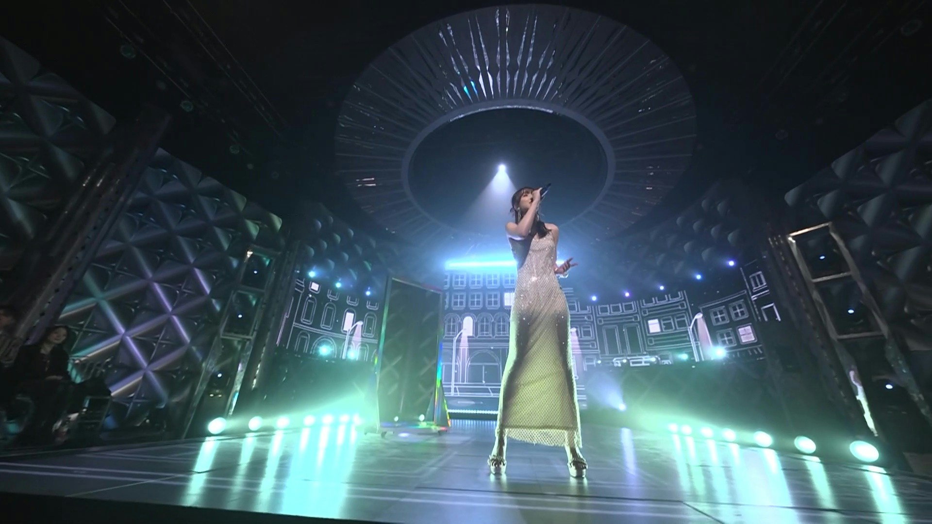 甄敏芳Jenny演唱《山林道》,以一身緊身透光長裙,若隱若現地展現白滑美腿,更大露美背勁吸睛。(官方圖片)