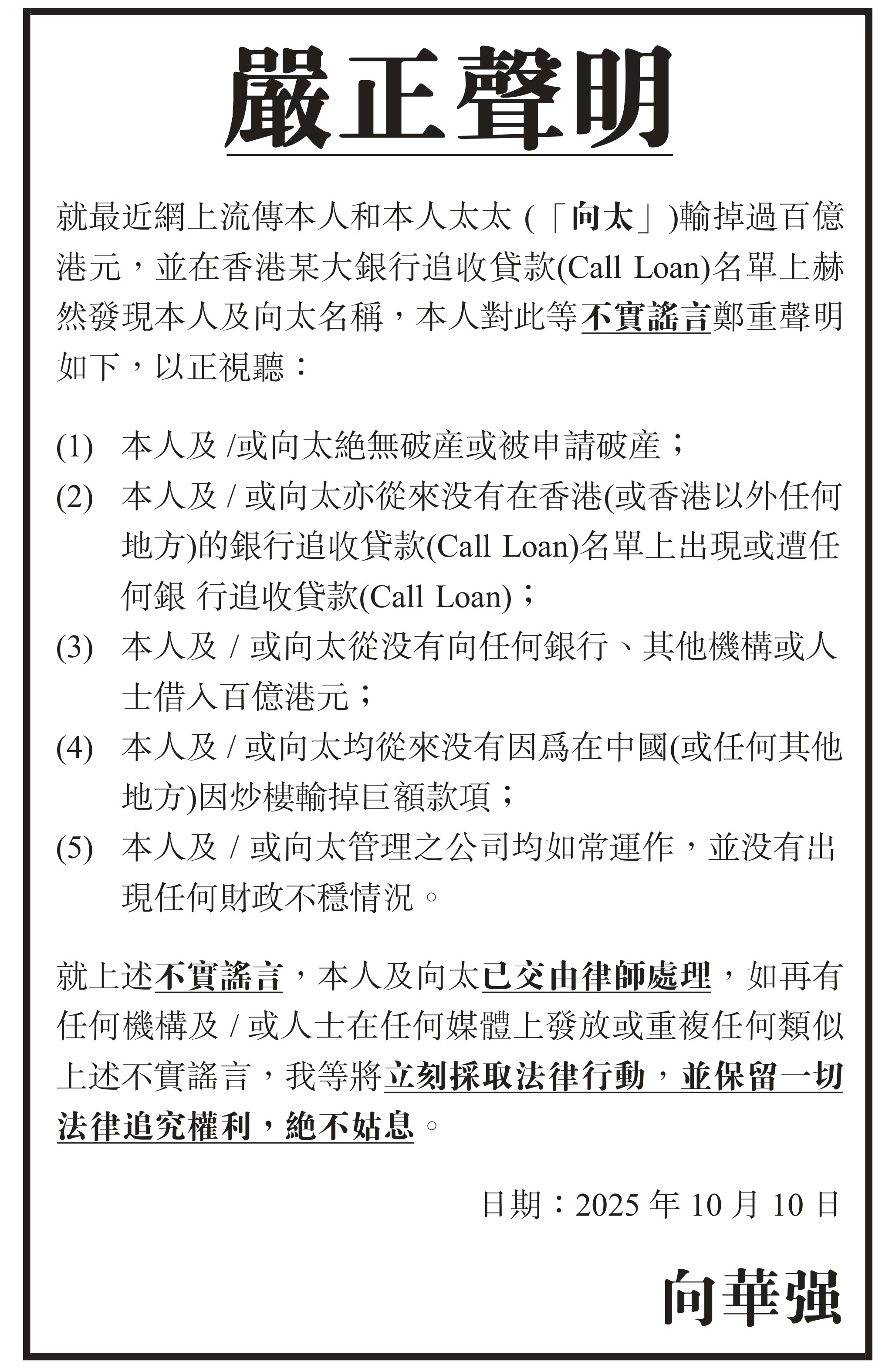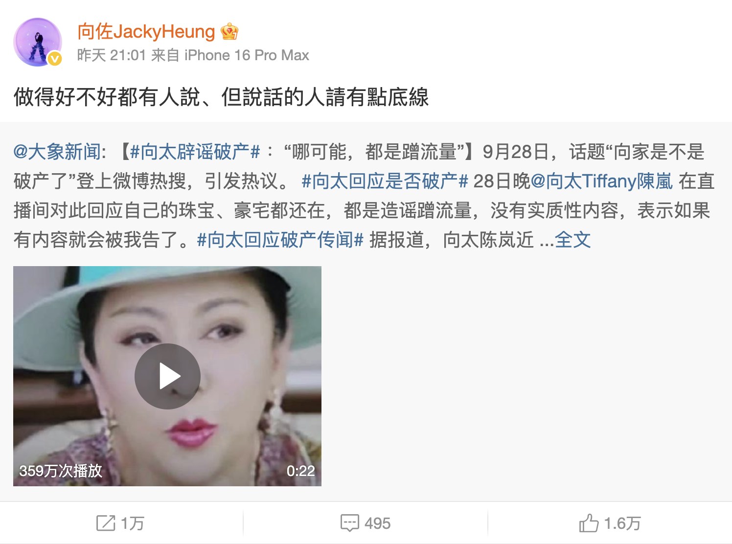 近日有傳言指向家陷入財困,「全家破產」。(微博@向佐JackyHeung)