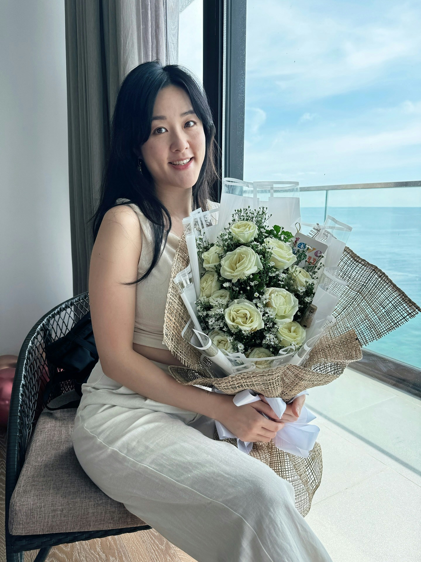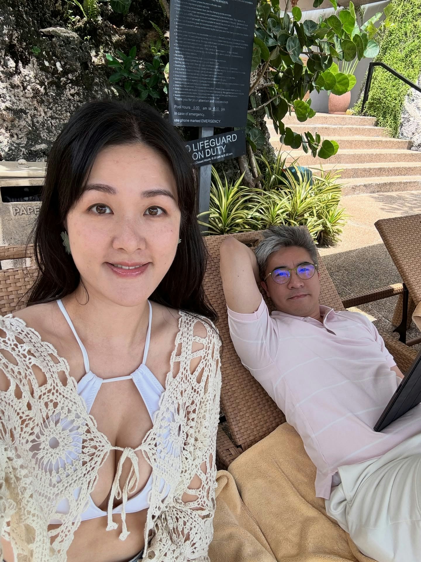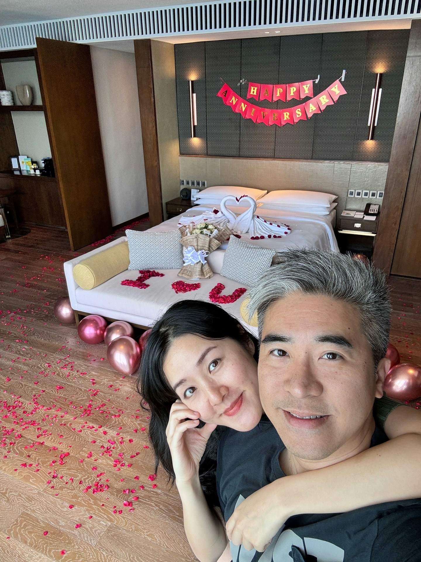 從鍾溥敏分享的照片可見,徐俊文為老婆準備了極致浪漫的奢華Villa享受二人世界。他們的酒店房內,超大床鋪上佈滿玫瑰花瓣,並砌出「I love you」字樣,床頭更以花瓣砌出「Happy Anniversary」。其中一張照片中,鍾溥敏從後環抱老公,十分溫馨。鍾溥敏亦不忘大派福利,在海灘上身穿一件心口有大窿的幼帶比堅尼,雖然外披喱士外套,但仍難掩驕人上圍,大晒火辣身材。