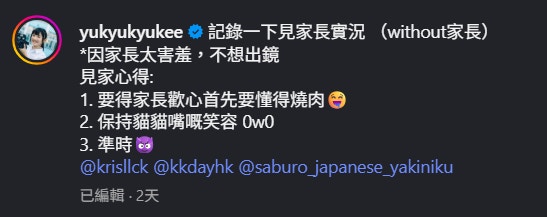 羅毓儀事後在IG貼出與林俊其的合照,並分享見家長心得,「1. 要得家長歡心首先要懂得燒肉🤤 2. 保持貓貓嘴嘅笑容 0w0 3. 準時😈」。當有網民問及林俊其見家長當日出了甚麼四字金句時,羅毓儀則回覆說:「有!虛張聲勢講咗做張聲作勢∠( ᐛ 」∠)_」,可能真的太緊張。