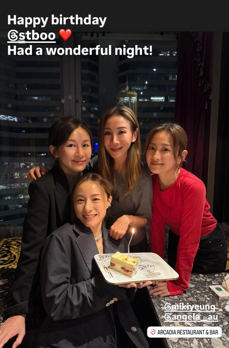 鄧麗欣(Stephy)舊愛、台灣男星王子(邱勝翊)昨日(29日)被范姜彥豐點名介入他與粿粿(江瑋琳)的婚姻,其後王子發文坦承與粿粿「超過了朋友間應有的界線」。而曾與王子拍拖3年最終分手收場的鄧麗欣,昨晚與Cookies前成員楊愛瑾(Miki)、區文詩(Angela)及陳素瑩(Gloria)一起慶生,似乎完全無被前度的偷食醜聞影響心情!