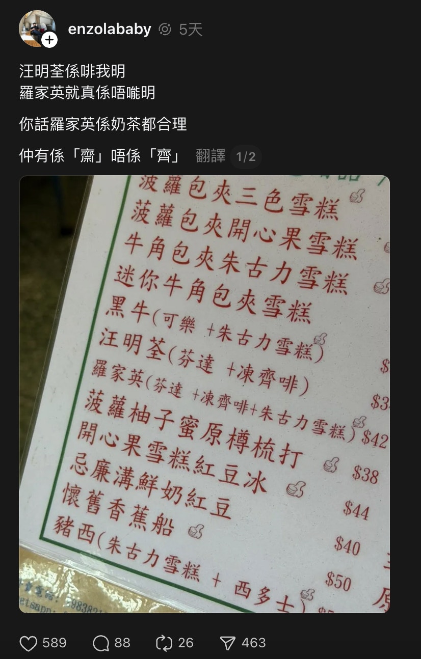 「汪明荃」和「羅家英」到底是什麼東東?!餐牌上就有寫為芬達加凍齋啡和芬達加凍齋啡加朱古力雪糕。不過,網民就求問改名背後的思路。有網民就解釋,表示汪明荃與英文Orange的發音類近,又有一首名曲《熱咖啡》,所以飲品順理成章就叫「汪明荃」。至於芬達加凍齋啡加朱古力雪糕為什麼叫「羅家英」,有網民解讀:「因為cho(羅) co(家) late(英)」,還有網民笑言是因為「汪明荃」是芬達加凍齋啡,加上光頭(朱古力雪糕)自然就是「羅家英」,相當有創意。