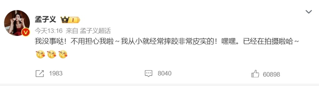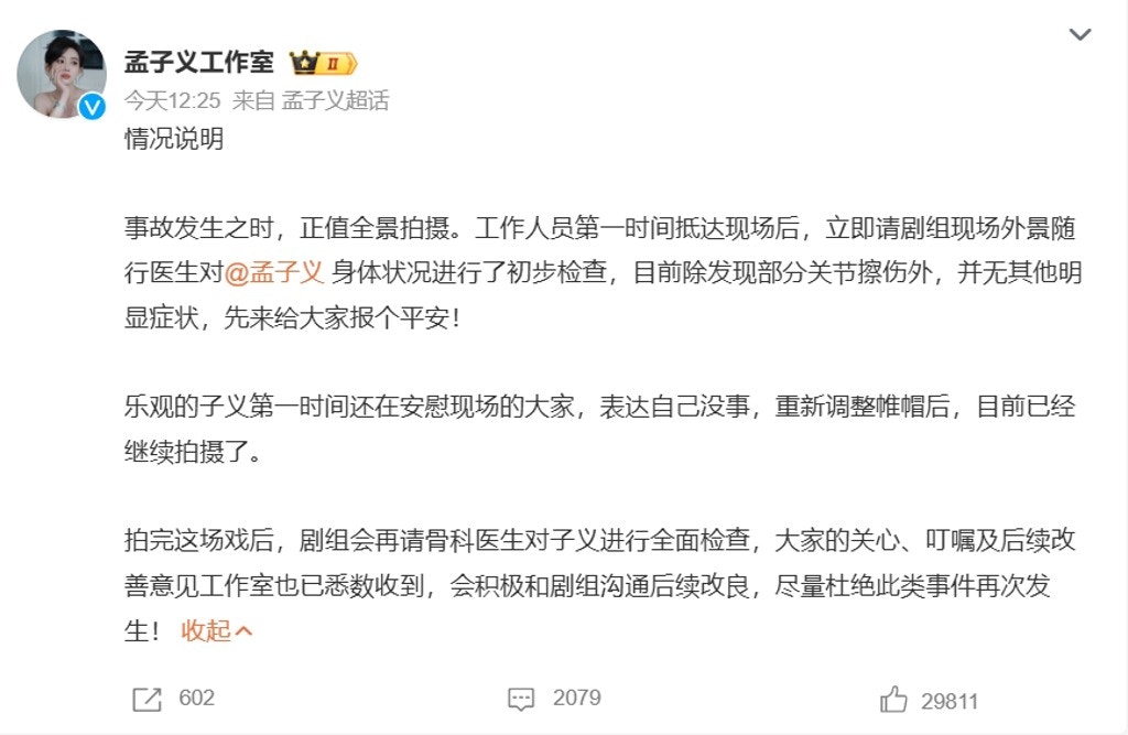 孟子義工作室發布聲明表示,事故發生後,劇組隨行醫生已進行初步檢查,除了部分關節擦傷外,並無其他明顯症狀。工作室也透露,孟子義在意外後仍保持樂觀態度,安慰現場工作人員,並在重新調整裝備後繼續拍攝。劇組將安排骨科醫生進行更詳細的檢查,同時也會就各界提出的改善建議與劇組進行溝通,避免類似事件再次發生。