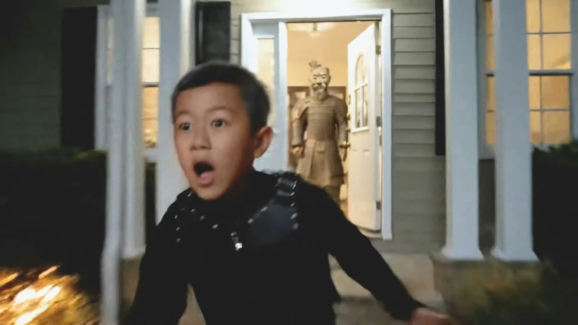 《尋秦記》由古天樂、林峯、宣萱及郭羨妮等主演。(《尋秦記》電影劇照) 第一條《尋秦記》萬聖節宣傳片中,一位與古天樂樣貌極似的小童按門鈴玩Trick or Treat,但竟然發現一具兵馬俑開門,嚇得「小古仔」尖叫避走!嚇親小朋友後,兵馬俑竟突然除下「頭盔」,原來裡面竟然是戴上黑超的古天樂,更無奈地表示:「驚咩啫……見到自己都好驚嘅!」古天樂變成兵馬俑自己嚇自己,大玩《尋秦記》劇情基礎的穿越元素,而「小古仔」不論灰銀色髮型、古銅色肌膚與黑色戰鬥甲三項特徵,均神還原古天樂飾演的男主角項少龍,AI出乎意料地準確捕捉古仔的神髓,令不少影迷粉絲會心微笑!