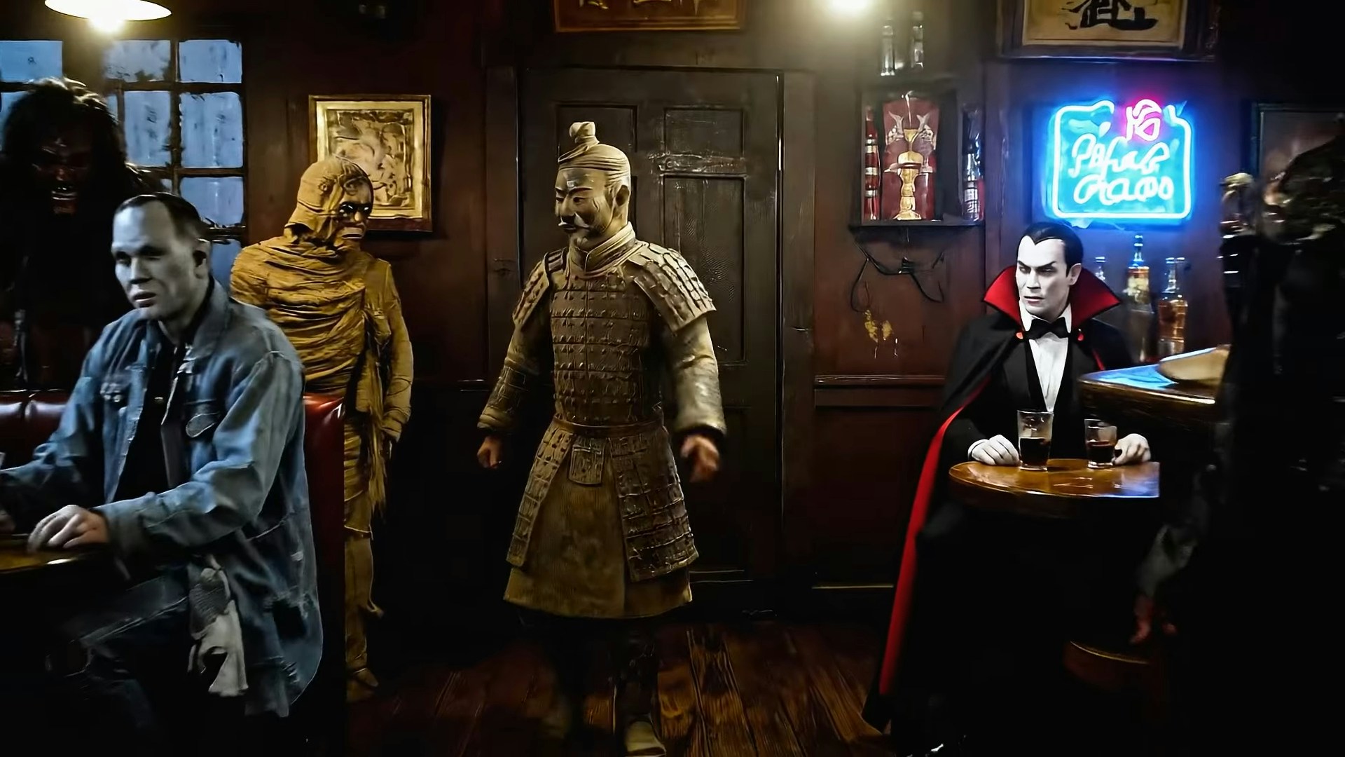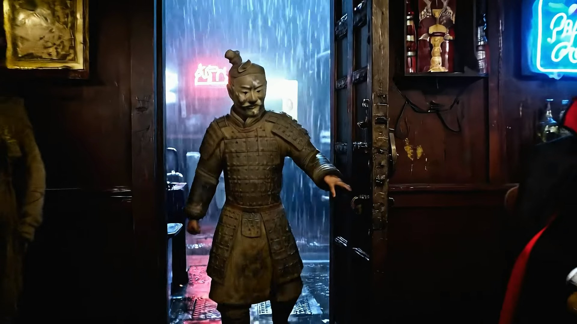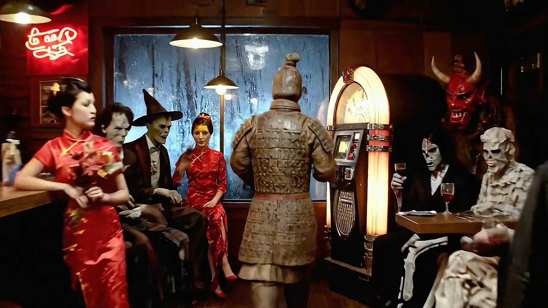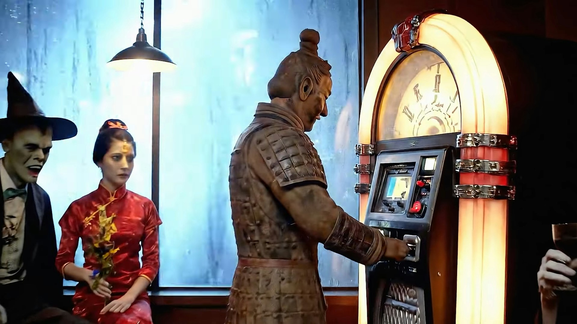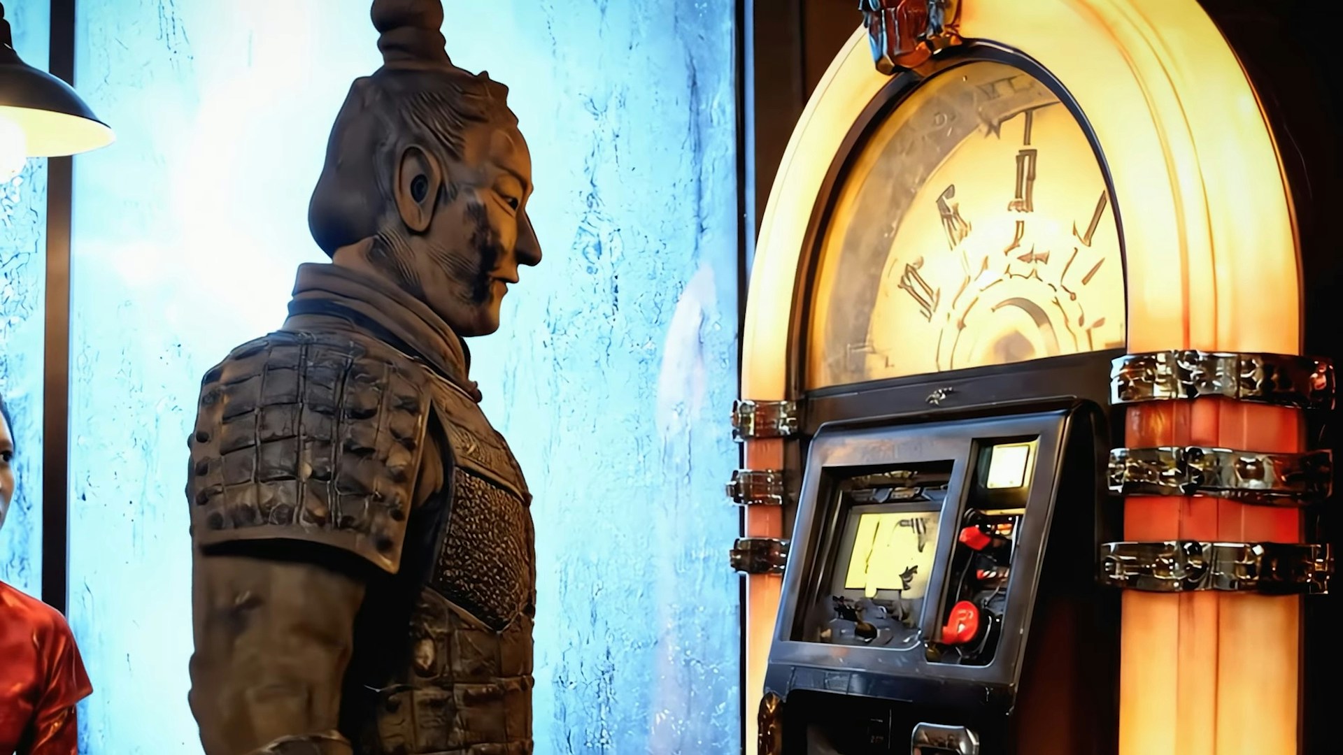兵馬俑行入酒吧,竟然對點唱機最有興趣!(Youtube影片截圖)