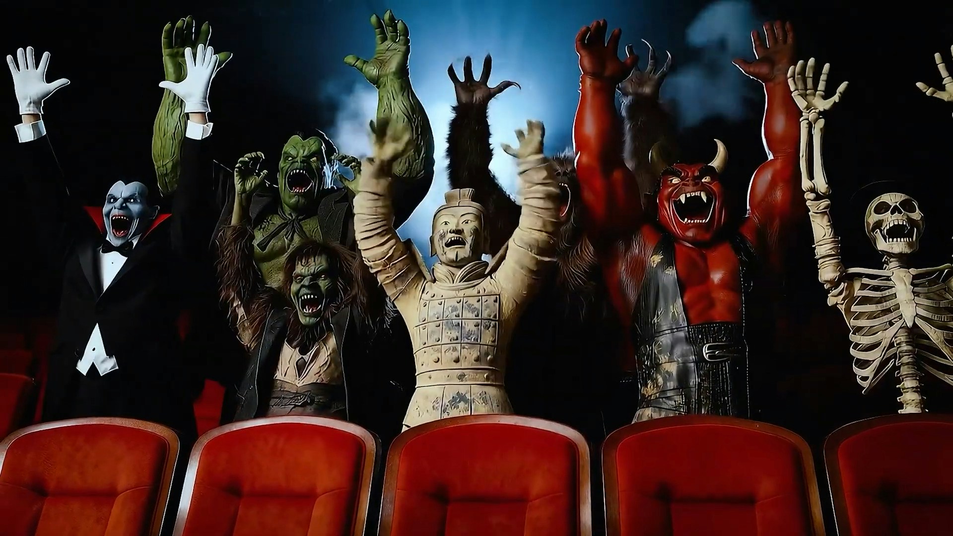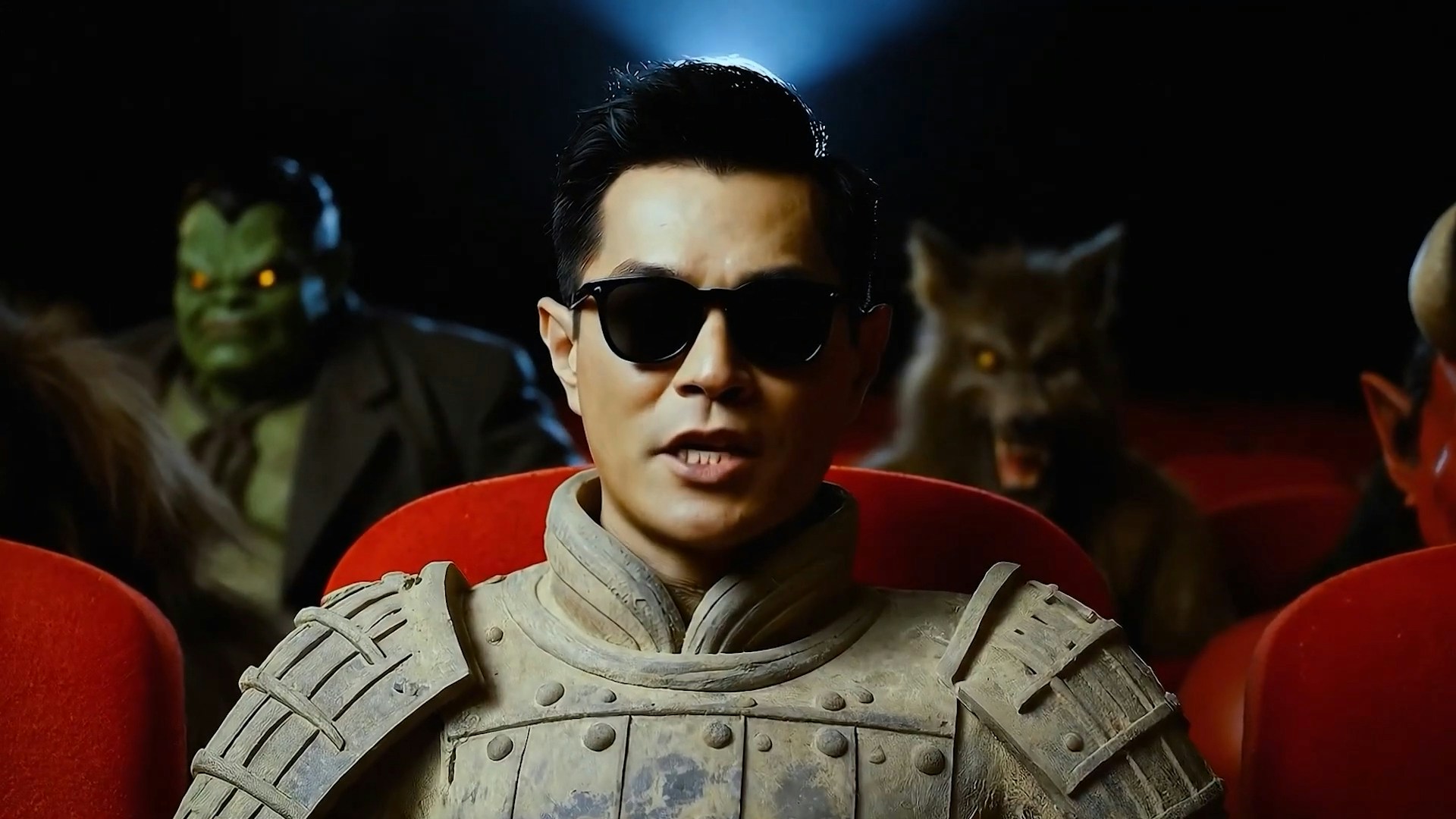 兵馬俑二話不說點唱《尋秦記》主題曲!(Youtube影片截圖) 《尋秦記》作為都市傳說電影,觀眾一直期待踏入戲院觀映一刻,兵馬俑亦不例外在第三段萬聖節宣傳片帶酒吧一班朋友到戲院,甫一看到《尋秦記》片頭出現在大銀幕上,便驚喜得一同站立歡呼,當然兵馬俑內的AI古天樂亦再除低頭盔,肯定地對觀眾宣布即將上映:「嘩!《尋秦記》呀!遲啲見!」