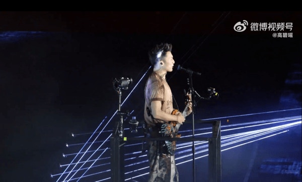 謝霆鋒在台上邊彈邊唱《潛龍勿用》時,舞台的鐳射光束多次射中佢嘅頭部。(微博圖片)