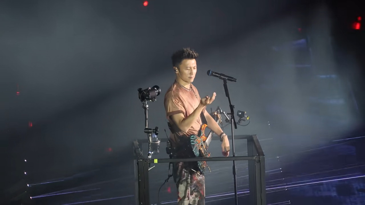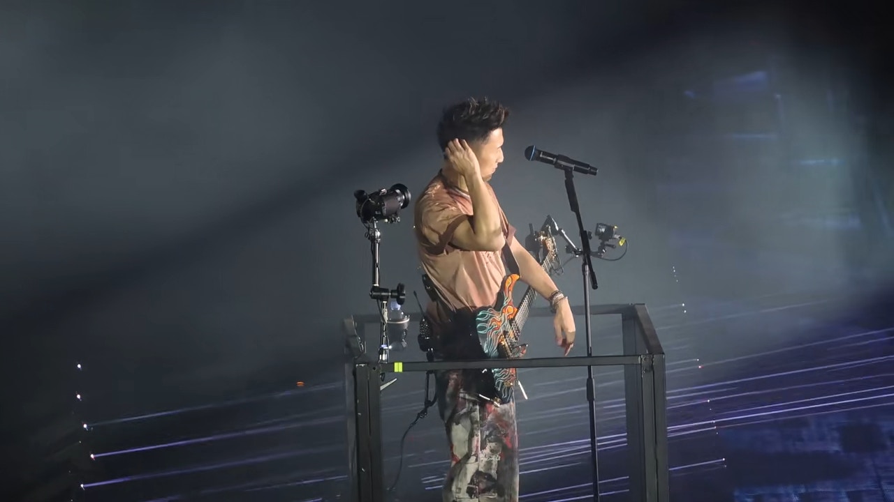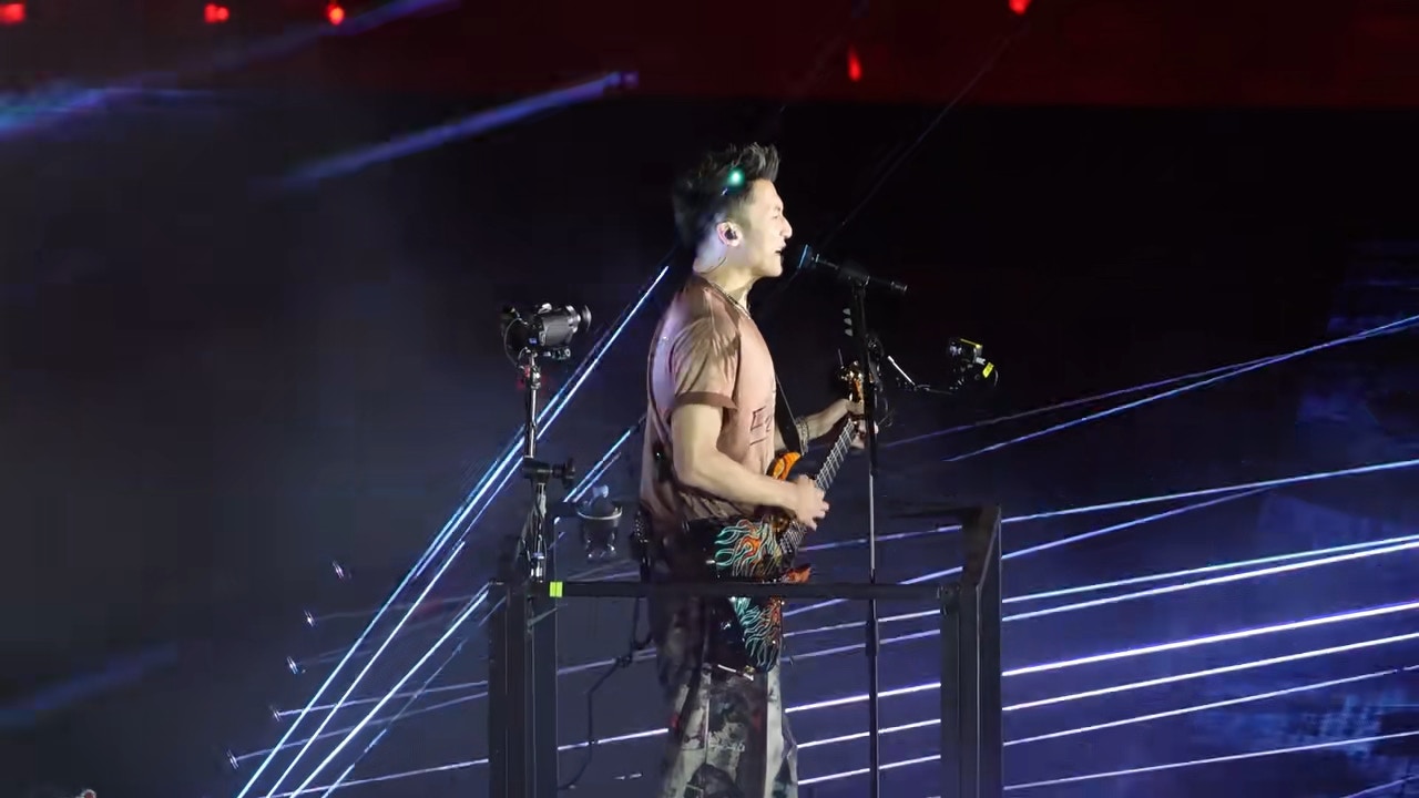 謝霆鋒在台上邊彈邊唱《潛龍勿用》時,舞台的鐳射光束多次射中佢嘅頭部。(小紅書截圖)