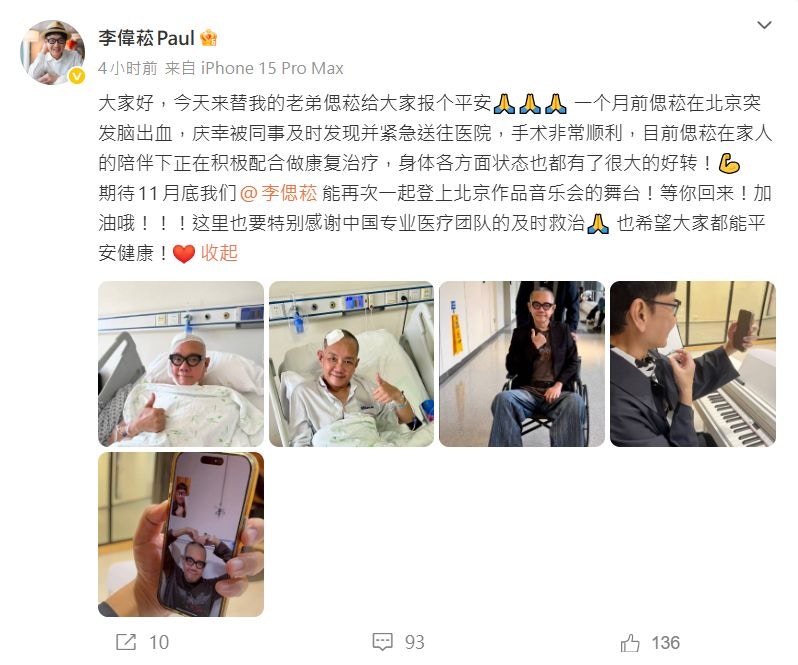 李偉菘前日(23日)在微博上公開透露了弟弟的病情,寫道:「大家好,今天來替我的老弟偲菘給大家報個平安,一個月前偲菘在北京突發腦出血。慶幸被同事及時發現並緊急送往醫院,手術非常順利。」目前,李偲菘在家人的陪伴下正積極配合康復治療,身體狀態「也有了很大的好轉!」