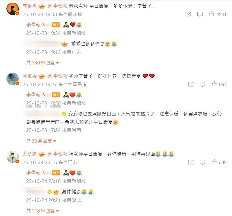 李偉菘透露胞弟李偲菘下個月有演出:「期待11月底我們能再次一起登上北京作品演唱會的舞台!等你回來!加油哦!!!」他亦不忘感謝醫療團隊的專業救治:「這裡也要特別感謝中國專業醫療團隊的及時救治,也希望大家都能平安健康!」