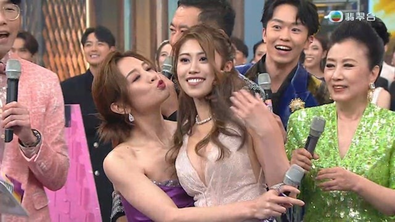 鍾翠詩在《萬千星輝賀台慶2024》的大抽獎環節上,獲抽中港幣43萬元,領獎時被麥美恩一擁入懷成為名場面。(截圖)