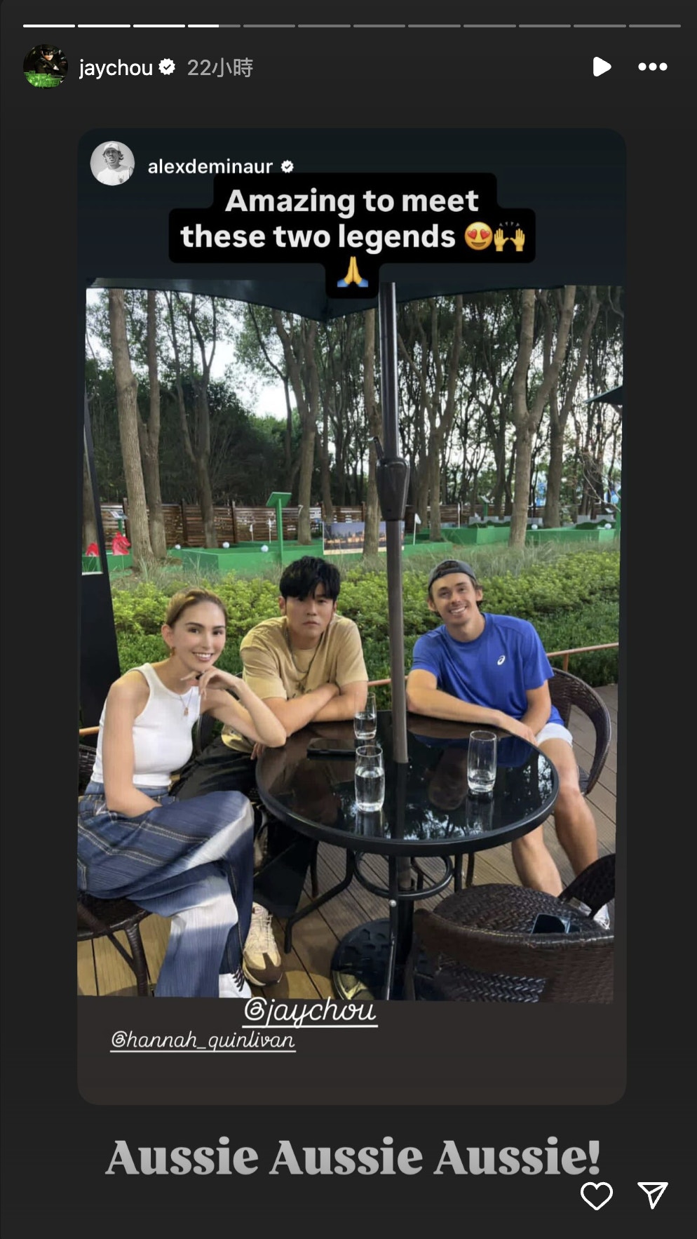 周杰倫近日到上海開騷都不忘網球,與昆凌跟太太同鄉、澳洲球手Alex de Minaur短聚,並為對方打氣。(IG@jaychou)