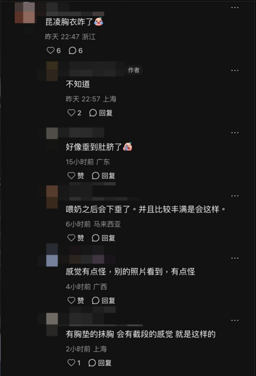 同時被不少球迷野生捕獲,昆凌上圍意外成焦點。(小紅書) 不過,昆凌身體上的另一變化卻令不少網民感到驚訝,紛紛留言:「昆凌胸衣咋了」、「好像垂到肚臍了」、「感覺有點怪」;但也有網民表示餵奶之後上圍會下垂,並且比較豐滿是會這樣,或者應該是衣服自帶的胸墊空杯太大了,才造成這種效果。