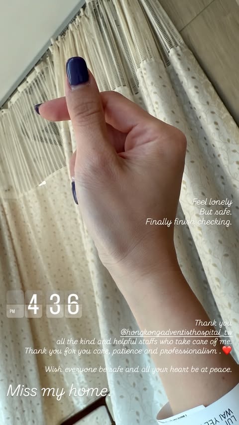 日前呂慧儀在IG限時動態曬出一張身處醫院的照片,雖然未有見樣,但可見她躺在病床上,並戴上病人手帶,上面寫有她的名字。呂慧儀寫道:「Feel lonely, but safe. Finally finish checking.」原來她今次是入院做檢查,身體並無大礙。不過其實呂慧儀曾在街上突然暈倒,全靠身旁兒子叫醒,膊頭及手腳皆有擦損,其後入院做身體檢查,休息後重新投入工作:「終於覆診完曬,無大礙了,已經排除了心臟和腦的問題,醫生說我保持均衡飲食,多做運動,時刻注意身體健康就可以了!」