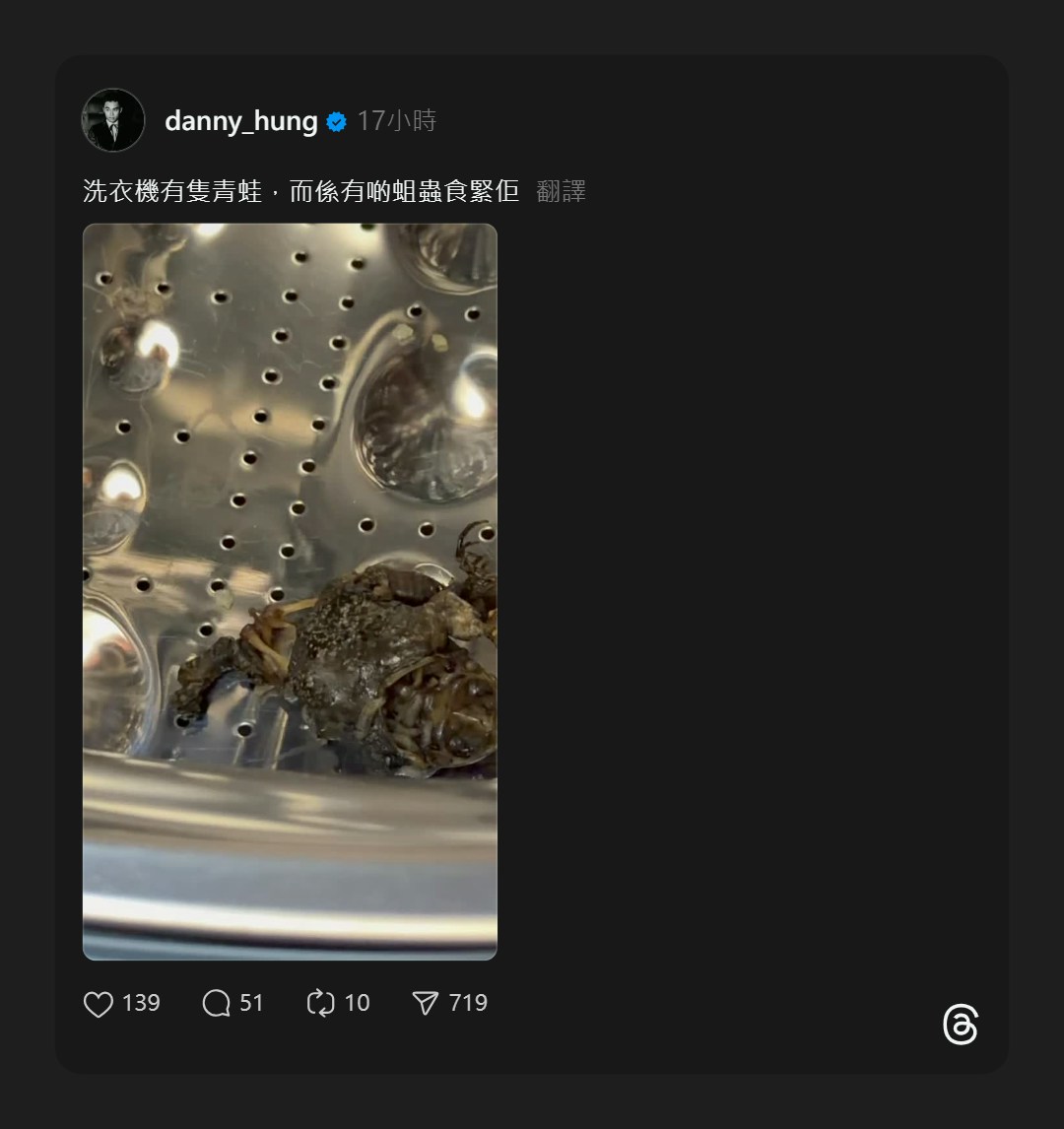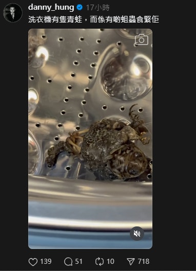 原來孔德賢在社交平台分享了家中洗衣機的照片,細心一看原來裡面有隻青蛙,洗衣機裡面有青蛙已經夠恐怖,他更寫下:「洗衣機有隻青蛙,而係(且)有啲蛆蟲食緊佢。」完全是令人覺得噁心,因為影片中清晰可見青蛙上面有些還有蠕動的蛆蟲。網民都紛紛留言表示恐怖,連洗衣機都不能要了:「部洗衣機可以唔洗要了」、「啲蟲同我之前蛋白粉杯入邊嗰啲差唔多」、「你部洗衣機唔要得喇。 好污糟,好多蟲」、「好核突丫」、「講還講唔好貼相」。亦有網民搞笑表示:「gym X表示:有50g protein」,因為蛆蟲充滿蛋白質,難怪有網民會聯想到蛋白質。