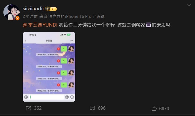 一位內地網紅司曉迪於微博發文指控李雲迪:「你想睡我,把我帶到xx酒店,趁我已經吃了安眠藥安靜入睡,不知道你做了甚麼齷齪的勾當,拉黑我是甚麼操作啊?偉大的鋼琴家,我現在可是一個神經病,別惹我哦寶寶。」之後她繼續罵李雲迪:「我真的很討厭李雲迪了!!!」司曉迪連番發文,更要李雲迪在3分鐘內解釋,她更氣到瘋的說:「我給你三分鐘給我一個解釋,這就是鋼琴家的素質嗎?」事件馬上登上熱搜,更引起不少網民熱議。