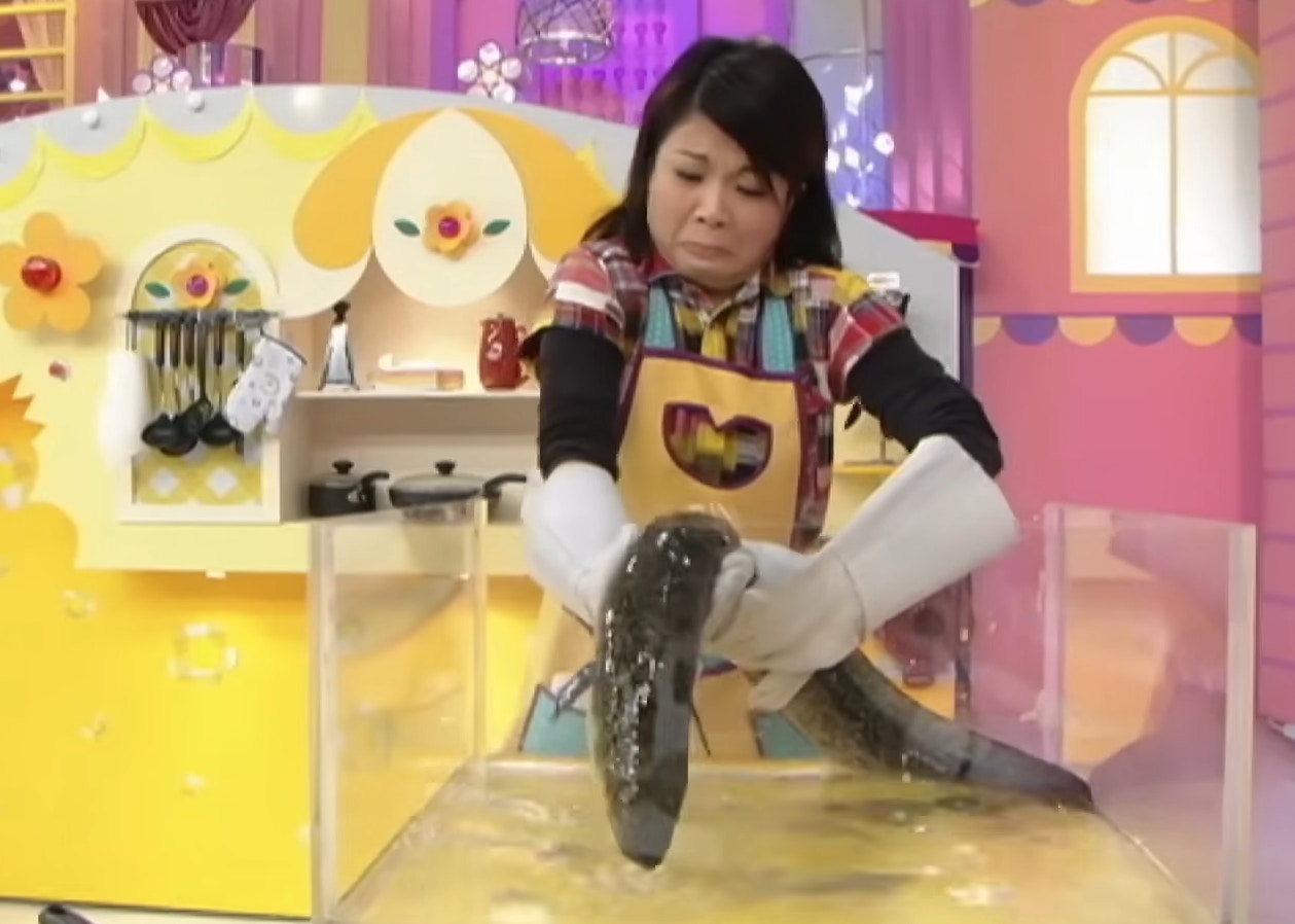 小儀雖然害怕,仍頂硬上活捉鰻魚。(TVB《美女廚房》影片截圖)