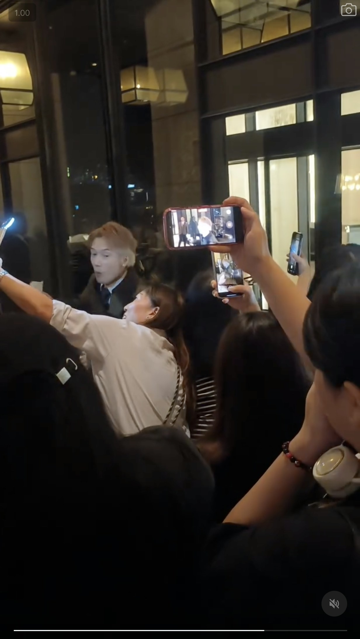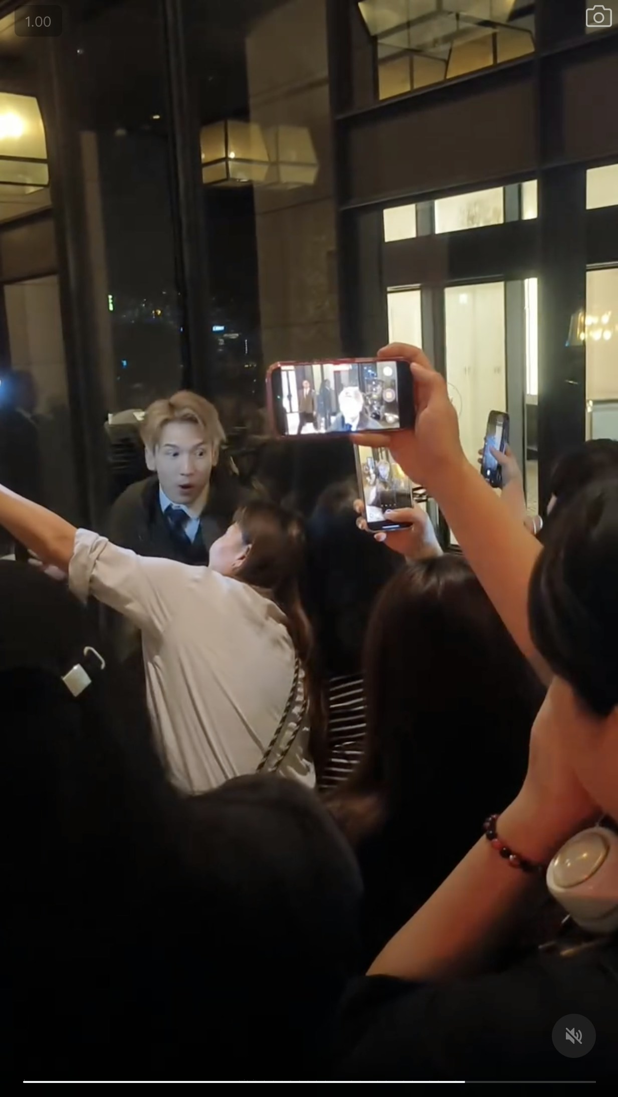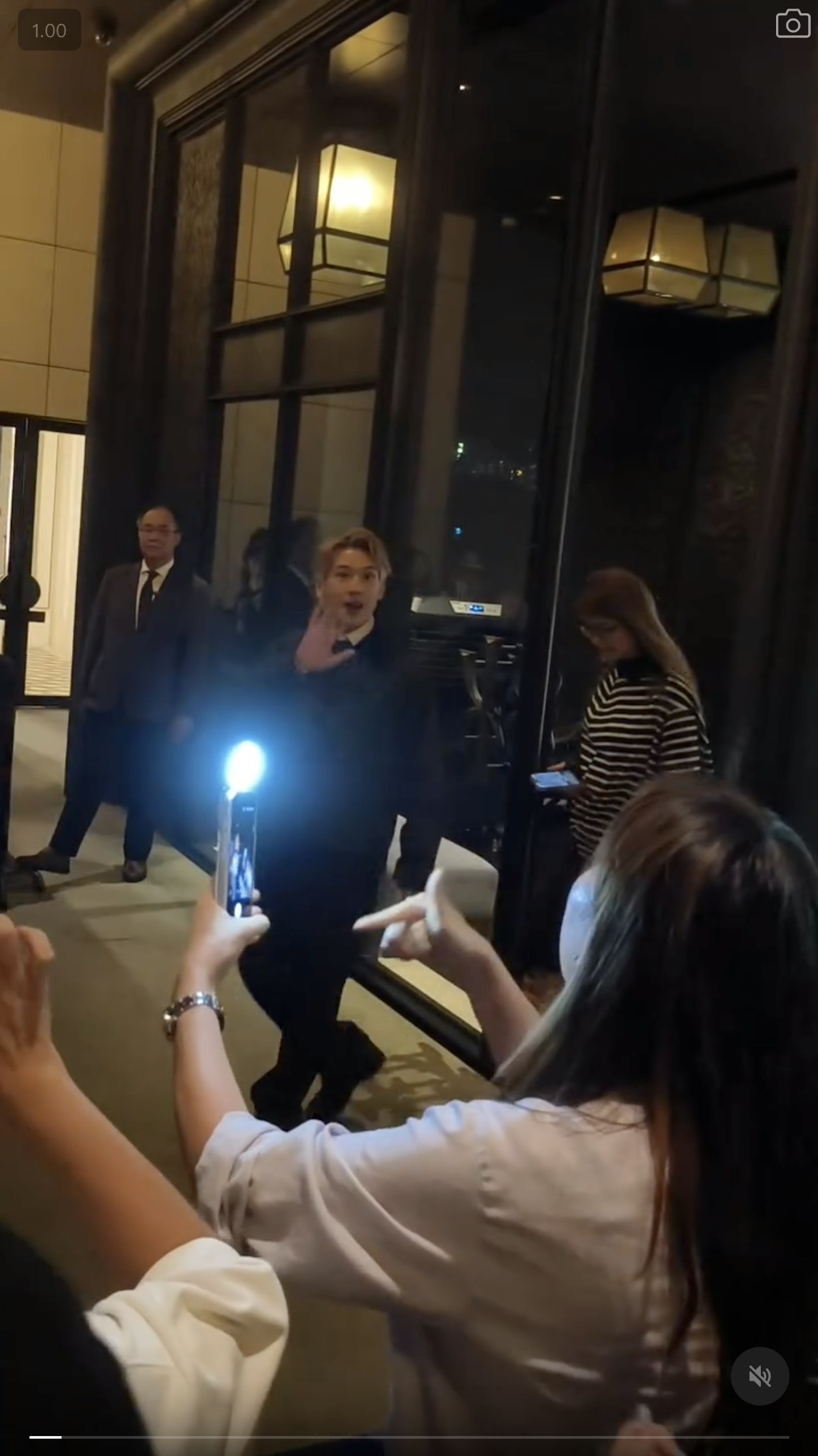 網上一條短片所見,關智斌路經酒店大門時,被追星族叫停要求走近合照。(Threads@kennykwan.yen)