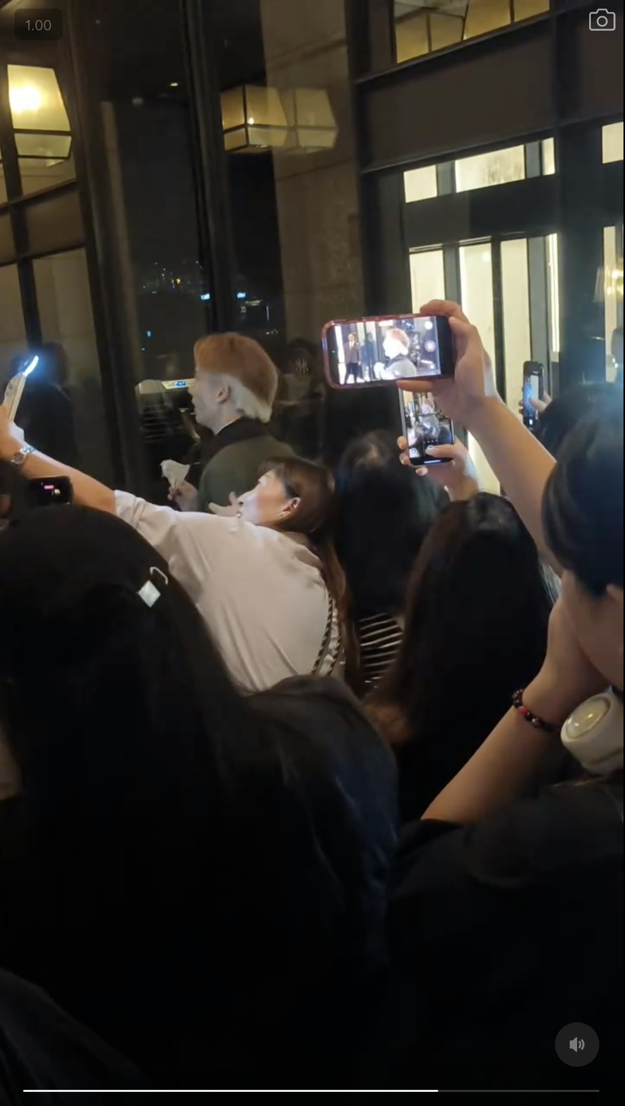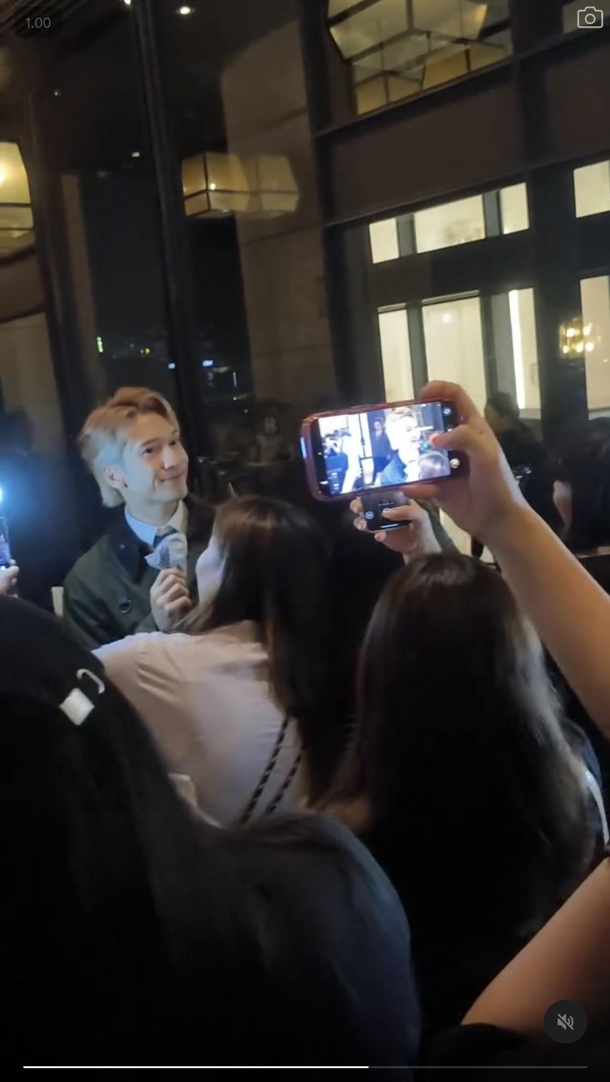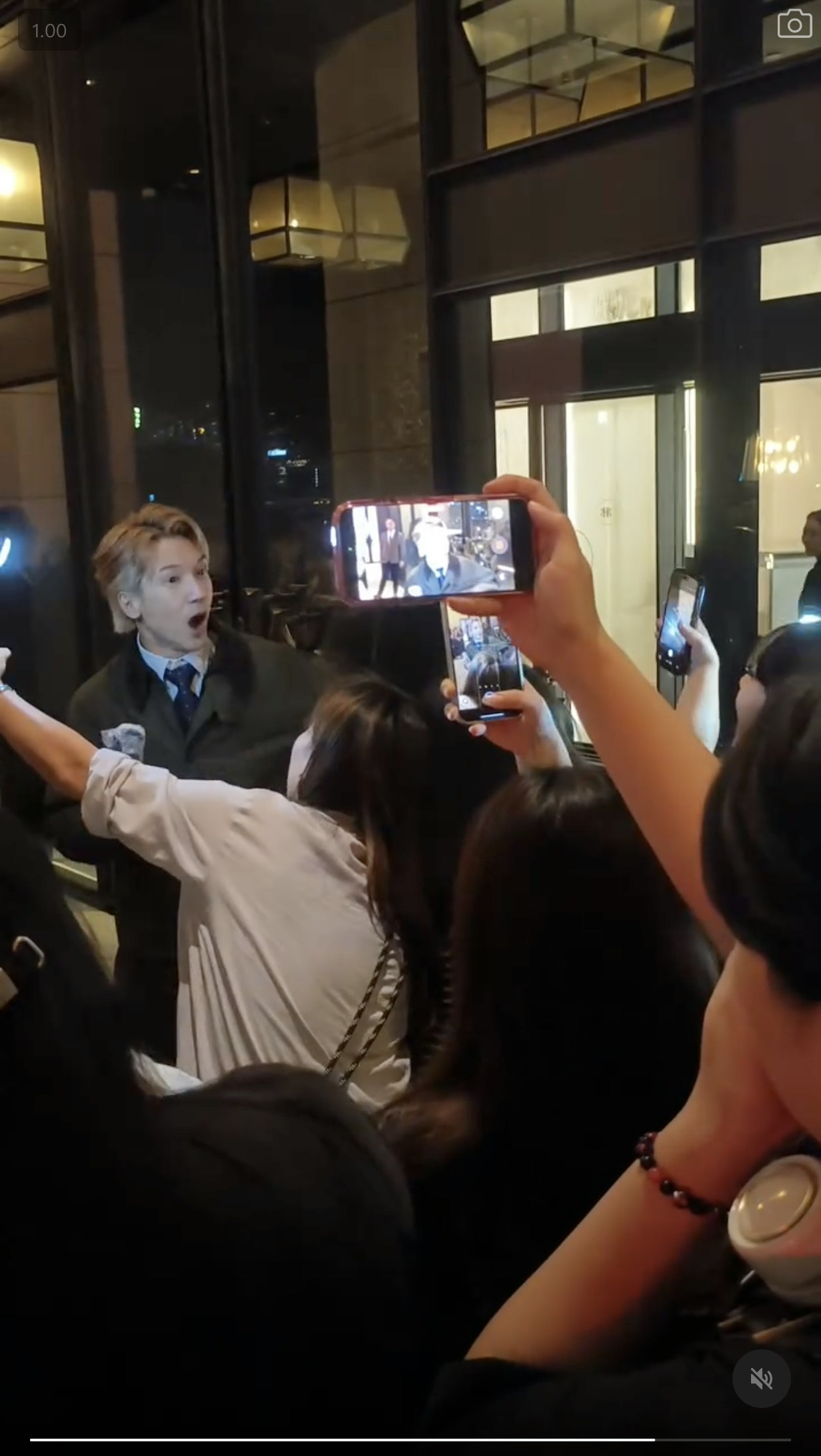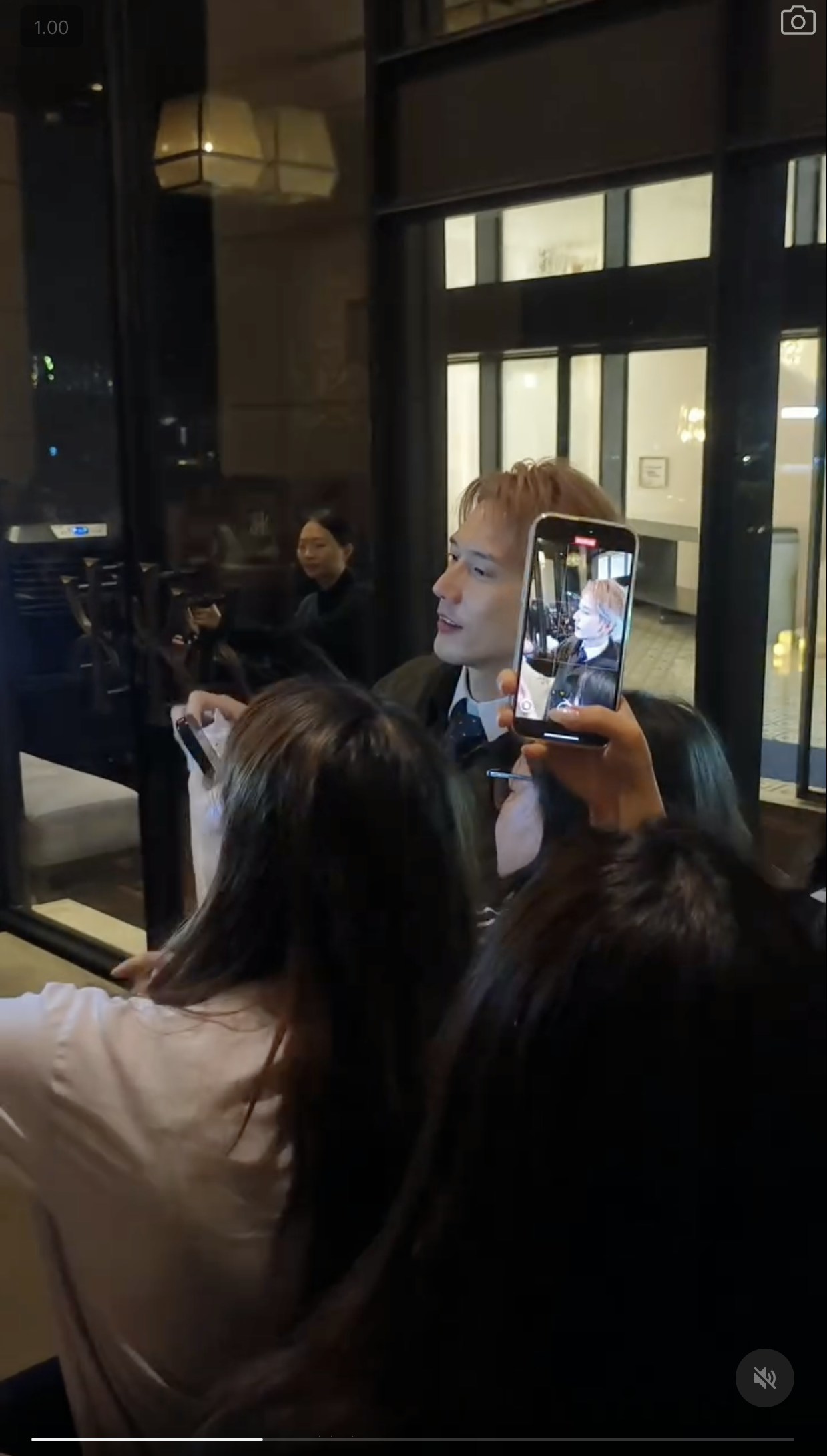 網上一條短片所見,關智斌路經酒店大門時,被追星族叫停要求走近合照。(Threads@kennykwan.yen)