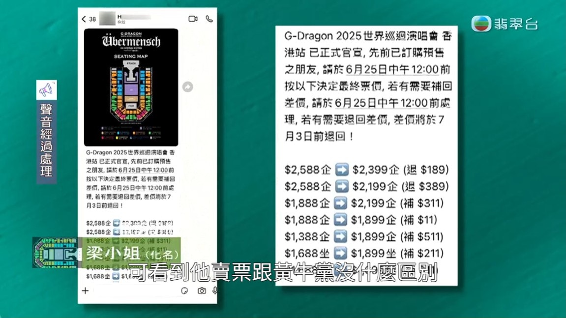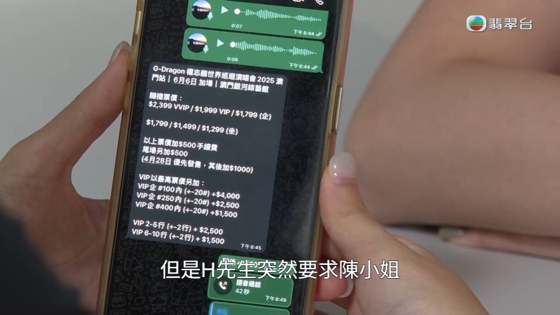 當時還在凍肉店工作的陳小姐,突然被H先生要求處理交收演唱會內部門票:「當呢個係工作係新嘅發展渠道。佢就講得實牙實齒,好有信心做呢壇野。」H先生除了叫陳小姐去交收門票外,還利誘她成為「艇仔」,只要成功賣出一張門票就有佣金300港元。陳小姐拒絕了H先生,不做艇仔,但因為自己跟朋友都是G-Dragon fans,所以向H先生買飛。