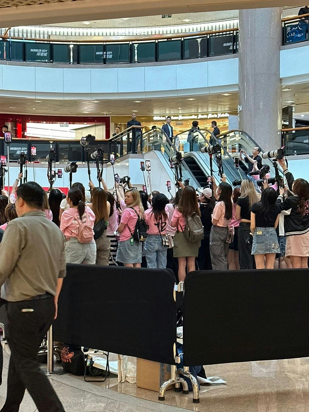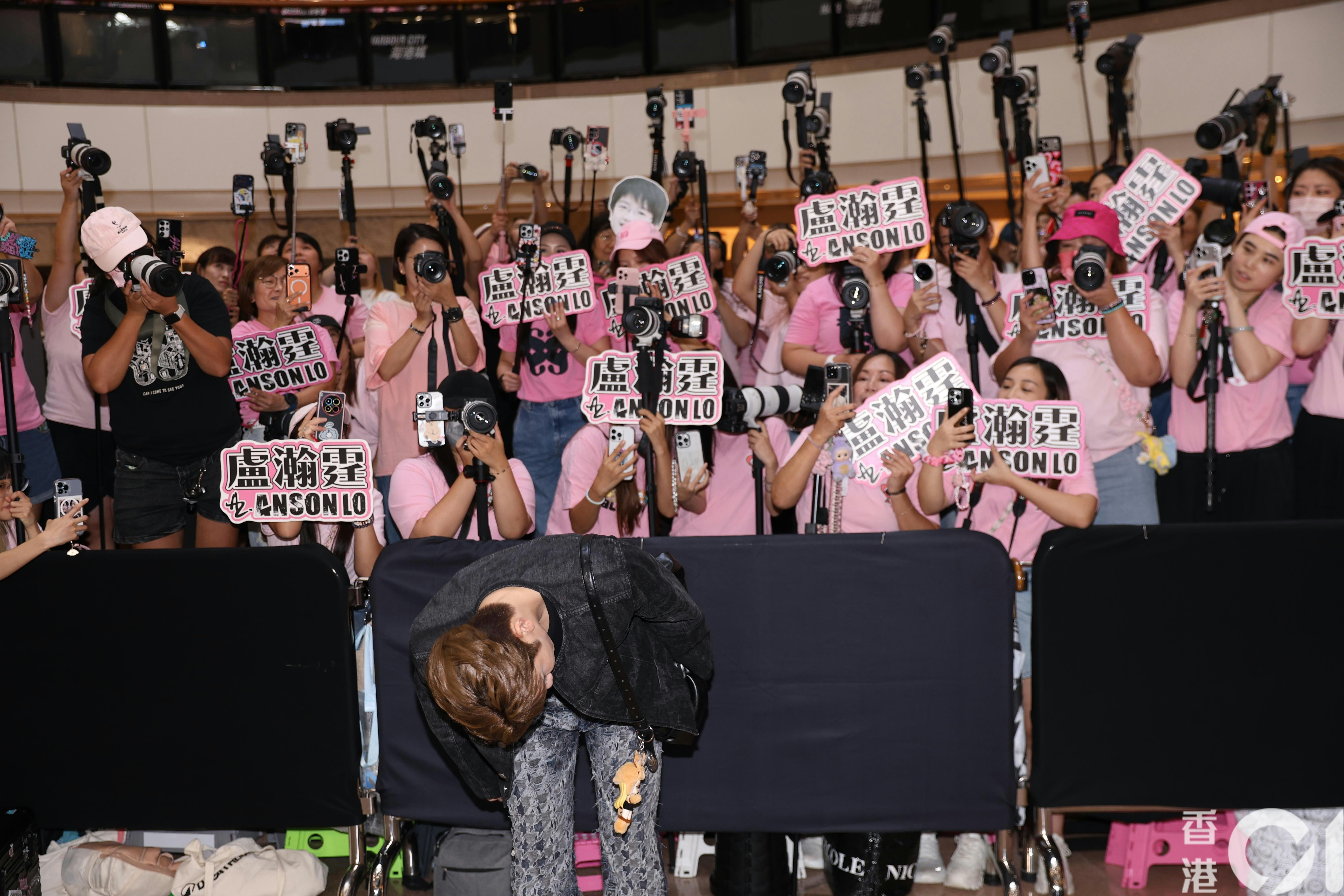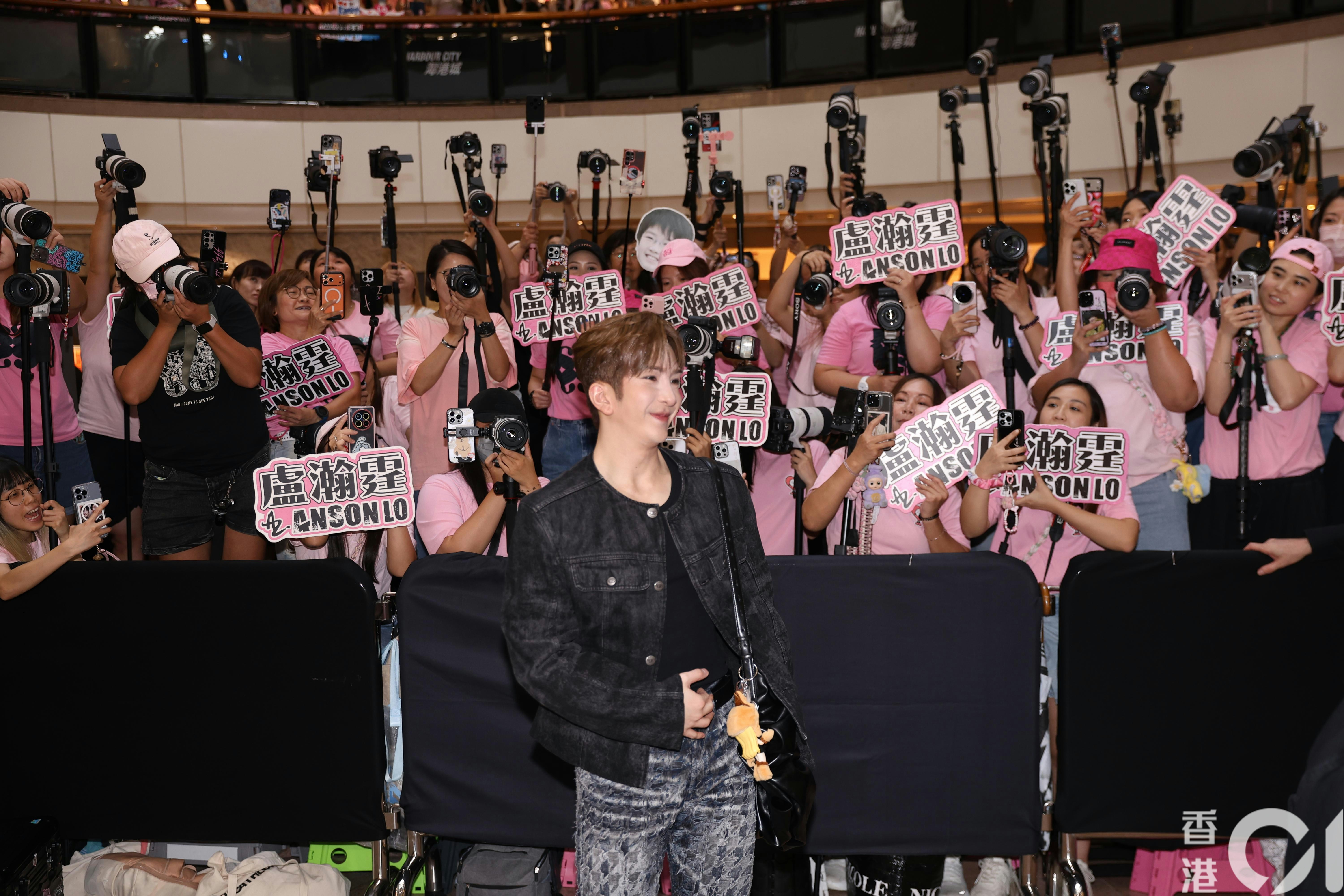 相中可見有一排一式一樣粉紅色上衣的粉絲,再加上大部分粉絲都拿著專業相機加腳架向著一方向拍照。但是人數比起以往的活動好像少了不人,因為商場還有路能走,眾所周知,以往MIRROR成員一出席活動都會有令商場有「淪陷」的情況出現。但今次一樓及二樓明顯還有不少位置供粉絲觀看Anson Lo。