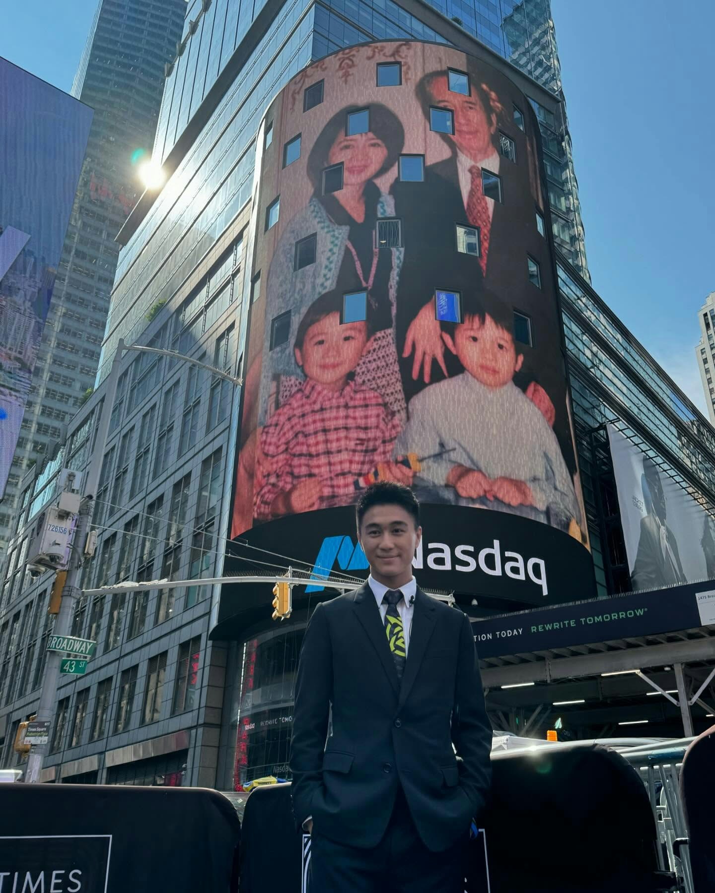 何猷君在NASDAQ的大電視前留影,牆上登著他與家人的合照,他指賭王以往常常出現在電視上,但應該未試過出現在NASDAQ的電視,他希望自己可以令父親感到自豪。(IG@momomarioho)