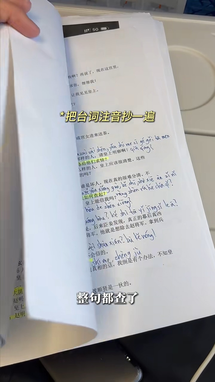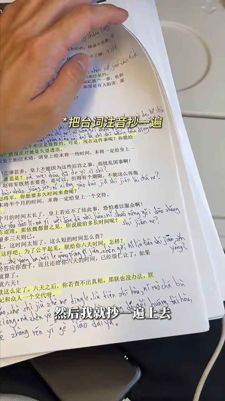 在劇本上寫滿密密麻麻的拼音。(影片截圖)