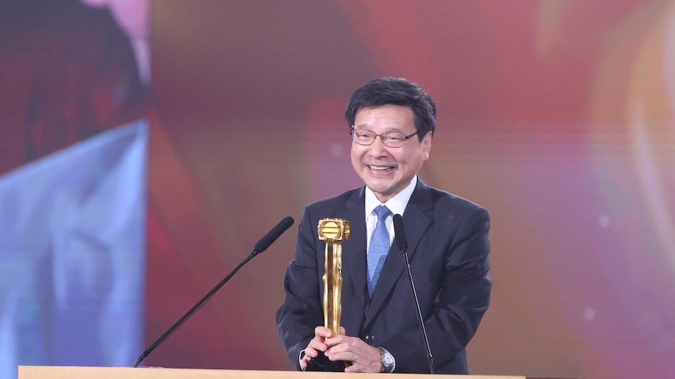 無綫新聞部主管袁志偉在《萬千星輝頒獎典禮2023》獲頒發「萬千光輝榮譽大獎」。(電視截圖)