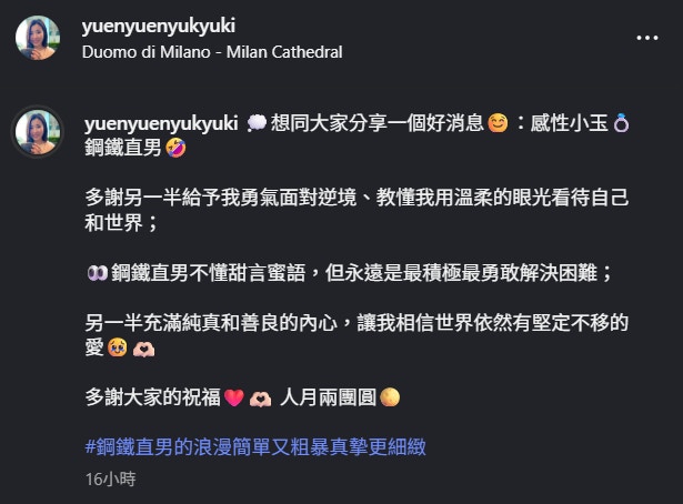 袁沅玉分享多張求婚照,袁沅玉穿上白色喱士短裙,如婚紗般潔白無比;男友單膝跪地捉住袁沅玉的手,令女方感動爆喊。一對準新人在米蘭大教堂前開心相擁及情深對望,袁沅玉還大騷手上的求婚鑽戒,寫道:「💭想同大家分享一個好消息☺️:感性小玉💍鋼鐵直男🤣多謝另一半給予我勇氣面對逆境、教懂我用溫柔的眼光看待自己和世界;👀鋼鐵直男不懂甜言蜜語,但永遠是最積極最勇敢解決困難;另一半充滿純真和善良的內心,讓我相信世界依然有堅定不移的愛🥹🫶🏻多謝大家的祝福❤️🫶🏻 人月兩團圓🌕#鋼鐵直男的浪漫簡單又粗暴真摯更細緻」不少友人都恭喜「小玉」:「戒指粒石好好好閃😎」、「Sweet」、「要幸福喔」。