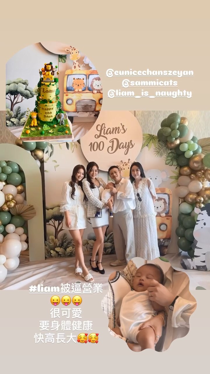 現場用上綠色氣球布置,有卡通動物坐在巴士上做佈景板,並展示「Liam's 100 Days」,每張枱上都有一種巨型卡通動物吊牌,以自助餐形式進行。陳詩欣撰寫感言:「Liam 一百日快樂🥰Daddy Mami 只係想講一句老土的說話,你開心快樂健康成長就夠啦,希望你喜歡Mami為你揀的動物主題🦁,因為你平時嗰件獅子睡衣真係着得你很可愛🤣」她更爆老公在現場的笑料,續寫道:「而陳生在百日宴上的感言,決定在這裏公開一下,他說『大家知唔知道點解今日係動物主題,因為我老婆就係嗰隻獅子!因為我老婆就係萬『瘦』之王!全場突然安靜了,而佢依然覺得自己講嘢好好笑🥰佢諗咗好耐㗎啦,大家俾啲掌聲鼓勵一下」。鍾晴留言問:「我以為係『獸』🤣🤣🤣吓!心諗咁大膽?😂😂😂😂😂」陳詩欣回覆:「冇人Get到點算呀?」