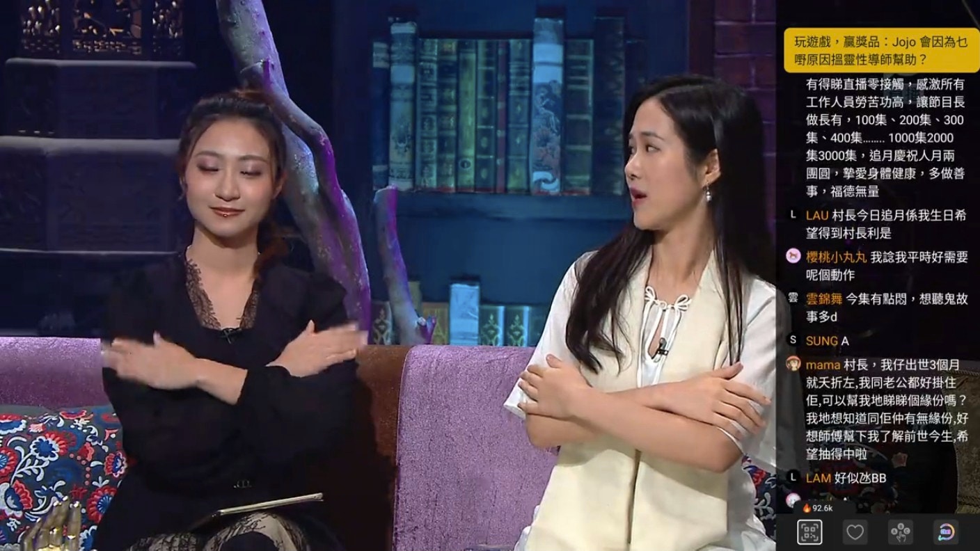 另外,Venus教授大家一個「蝴蝶拍拍法」,可以平伏情緒防止焦慮。方法是交叉雙手拍打左右手臂,令心情放鬆,加上適當描述即時狀況效果更佳,Darren即場示範,他一邊拍打雙臂一邊說︰「我係黃耀英,而家喺將軍澳電視(廣播)城3號錄影廠,做緊直播靈接觸…..」Venus表示此方法可以避免負能量積聚成為毒素,令到身體出現如濕疹一類毛病。