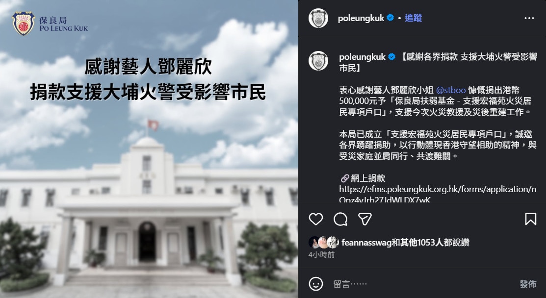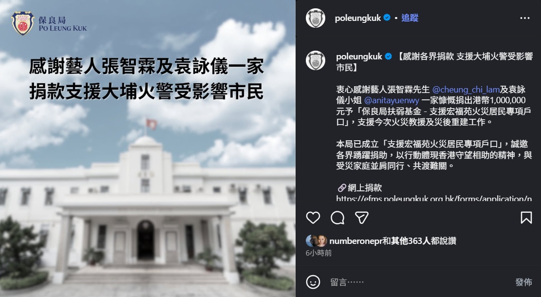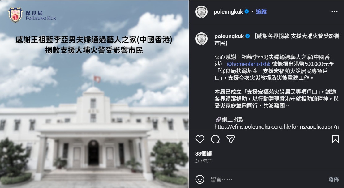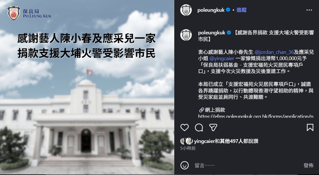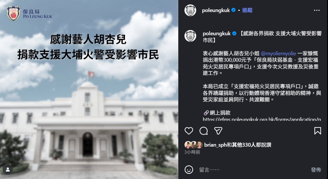 保良局已成立「「支援宏福苑火災居民專項戶口」,誠邀各界踴躍捐助,以行動體現香港守望相助的精神,與受災家庭並肩同行、共渡難關。保良局今日收到多位演藝界人士捐出款項,並在instagram列出捐款人士的感謝名單,當中包括: