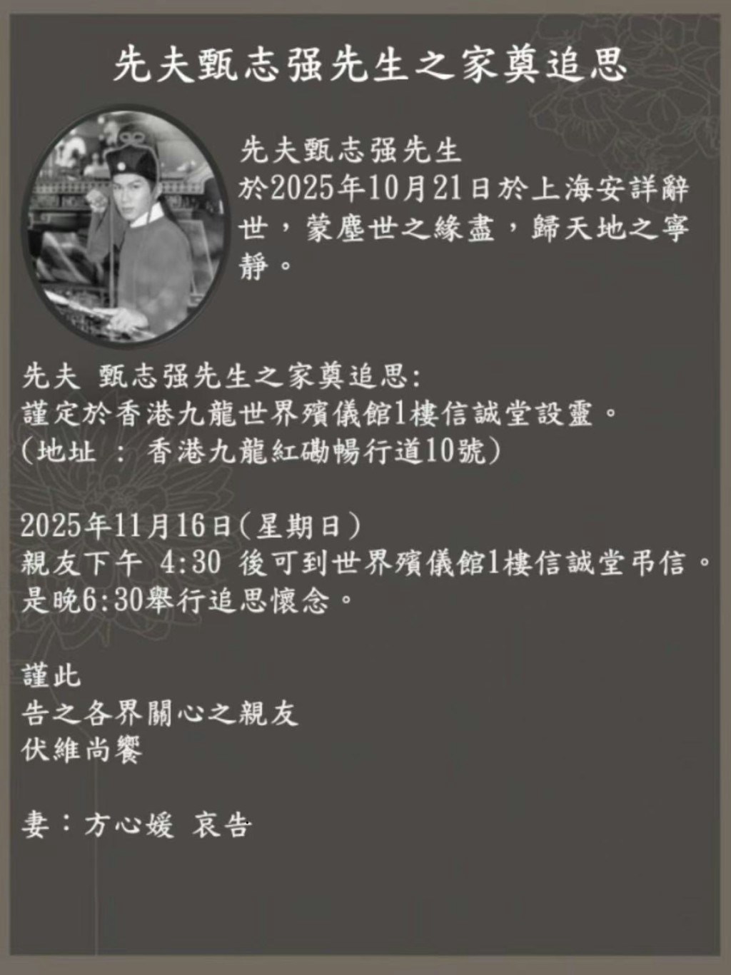 甄志強的太太方心媛公布家奠追思詳情。