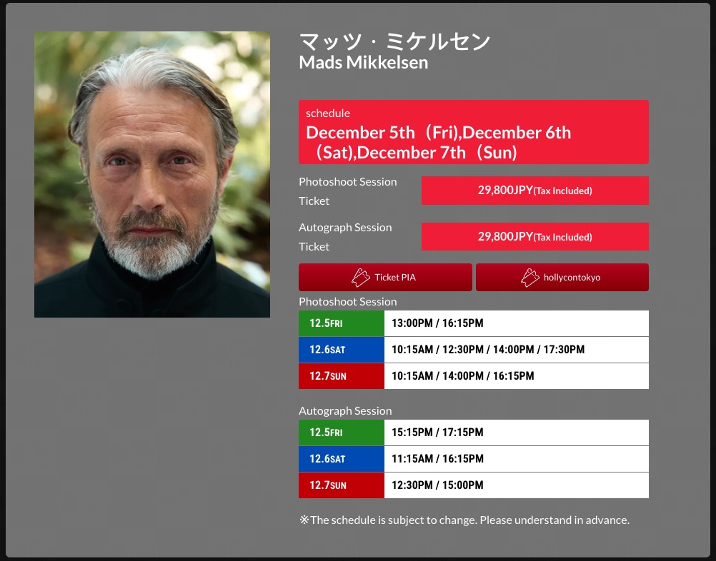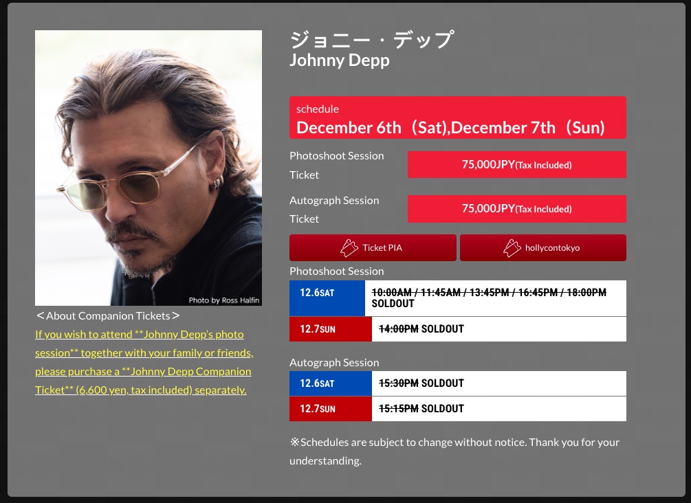 不過,價錢似乎並不是以他們的成就劃分,而是以他們在動漫界人氣區分。事關近年無大作,與《回到未來》的Christopher Lloyd合照就需26,000JPY(約$1,300),參與拍照環節則要28,000JPY(約$1,400)。另外,東京動漫展還有眾多荷里活明星出席,例如《制裁者》的Jon Bernthal、《哈利波特》的「Luna」Evanna Lynch、《死亡擱淺》主演Norman Reedus和Mads Mikkelsen,以及最令人期待的巨星Johnny Depp。據官網顯示,Johnny Depp的拍照環節和合照均要價75,000JPY(約$3,785)。Johnny Depp分別會出席8個場次,而且拍照,合照券一推出就已售罄。