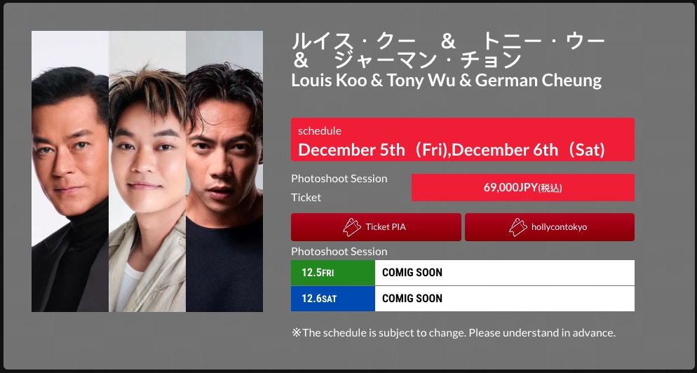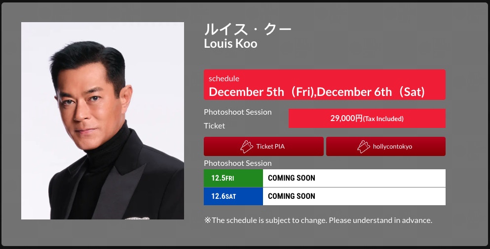當中,原來憑《九龍城寨之圍城》爆紅的古天樂、張文傑與胡子彤也在名單之列,拍照券售價分別為29,000JPY(約$1,460)和22,000JPY(約$1,110)。古天樂的拍照券售價亦僅低於丹麥影帝Mads Mikkelsen(麥斯米基辛)(29,800JPY)、Norman Reedus(29,800JPY)少許,及Johnny Depp(75,000JPY),甚至比《魔戒》「佛羅多」Elijah Wood和「山姆」Sean Astin還要多。