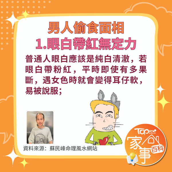 普通人眼白應該是純白清澈,若眼白帶粉紅,平時即使有多果斷,遇女色時就會變得耳仔軟,易被說服;一生易被感情所累,尤其在35至40歲行眼運時,必遇一個鍾情女性,戀情亦必被原配揭發,到時真會上演一幕家變。