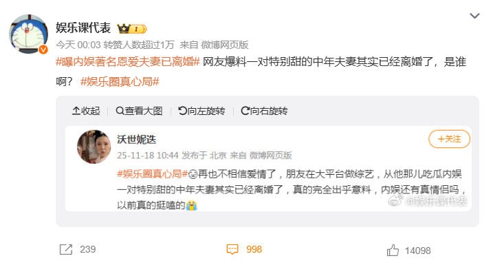 2025年11月18日,有微博用戶自稱通過「綜藝從業者朋友」獲悉,一對「特別甜的中年明星夫妻」已秘密離婚,為保護事業和孩子維持表面體面,但未透露具體姓名。該話題閲讀量迅速破萬,引發全網競猜。