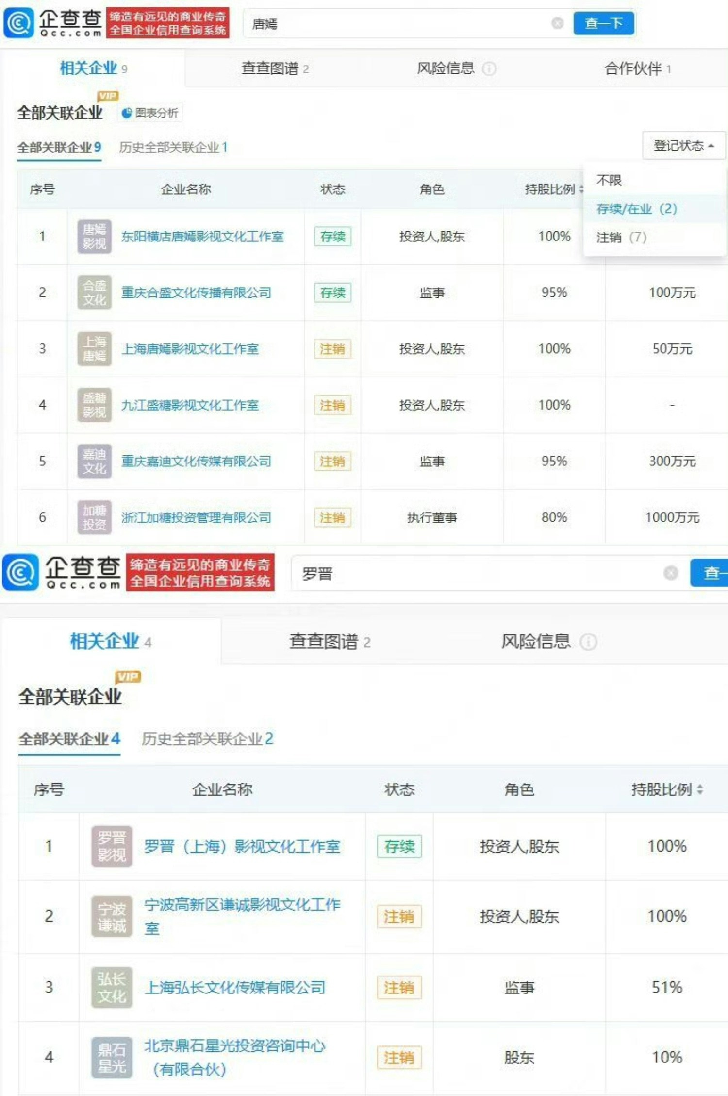 雖然唐嫣羅晉離婚只是傳聞,但有網民查詢了兩人名下公司,發現夫妻倆並無商業關聯。唐嫣名下有9家公司,但早就在2020年開始清理名下企業了,現在僅2家為存續狀態,分別是重慶合盛文化傳播有限公司、東陽橫店唐嫣影視文化工作室,其餘7家已註銷。羅晉名下有4家公司,僅羅晉(上海)影視文化工作室為存續狀態,其餘3家已註銷。