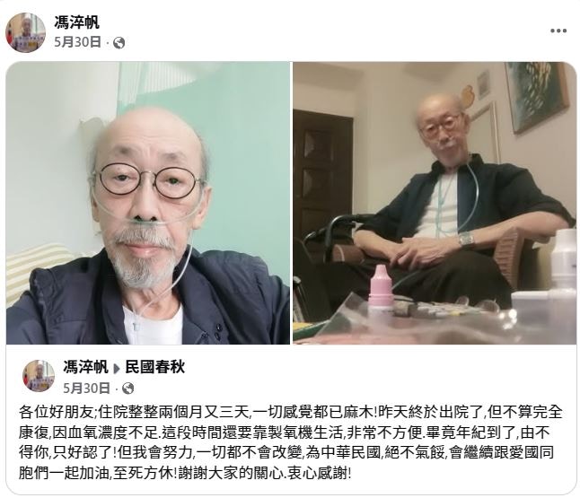 至5月30日再發帖文,透露住院2個月後才出院,當時他坦言不算完全康復,因血氧濃度不足,還需靠製氧機生活:「住院整整兩個月又三天,一切感覺都已麻木!昨天終於出院了!但不算完全康復,因血氧濃度不足。這段時間還要靠製氧機生活,非常不方便,畢竟年紀到了,由不得你,只好認了!但我會努力,一切都不會改變。」相中所目照片中的他,鼻上插著醫療用的鼻喉管,需要靠氧氣機來輔助呼吸,身形明顯比以往消瘦,雖然戴著眼鏡,但仍難掩臉上的憔悴。馮淬帆日前貼上昔日與許紹雄夫婦的合照念故友,當時他已經意有所指地說:「唉,終須一別,但我比你大,自己也病入膏肓,苟延殘喘....阿彌陀佛...賢弟那邊等,愚兄隨後來!」想不到竟一語成讖。