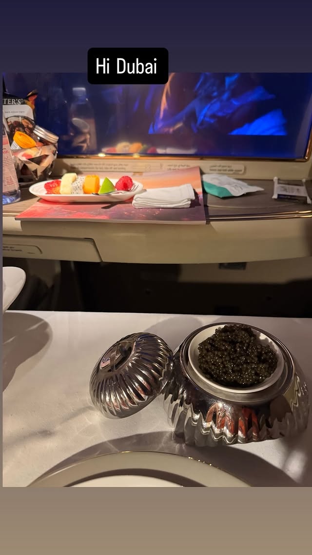 李美慧身處飛機頭等艙,一邊睇電影,一邊歎果盤同魚子醬,相當享受!(IG截圖)