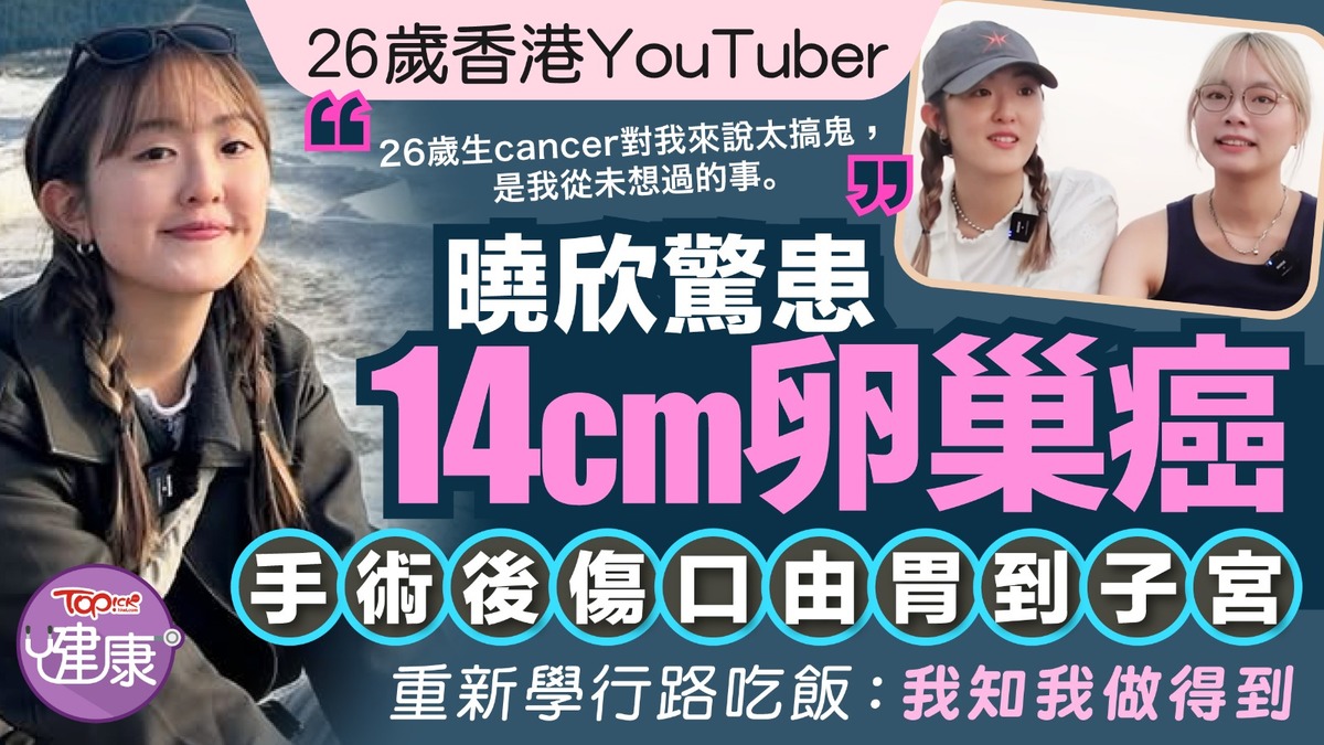 曉欣/卵巢癌/癌症/婦科病|癌症患者近年愈趨年輕,身體突然出現異樣要及時重視!香港知名YouTube頻道「入實驗室撳PLAY掣」以多元挑戰主題及美食探店等廣受歡迎,擁有超過13萬訂閱人數。頻道兩位主持人曉欣和Wing近日在影片中提及健康狀況,引發觀眾關注。年僅26歲的曉欣在片中透露「身體出現了些毛病」,並於10月底在社交平台公開確診卵巢癌的消息,透露體內發現長達14cm的罕見惡性腫瘤。