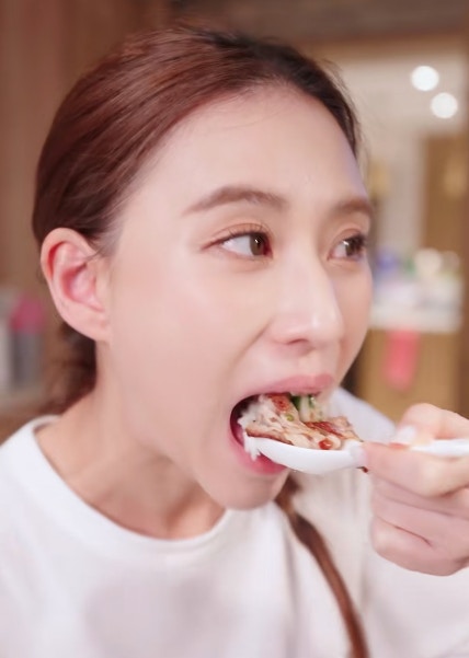 食譜的調味料分量,超蓮說可以按自己喜好調整,例如她很喜歡洋蔥,比例會多一點。飯弄好後,超蓮率先試試自己的手勢,飯、豬、醬一併放在勺匙上,大啖放進口裏,吃過大讚超級香。接着便是試食環節,短片中出現了三位女子,輪流試吃。