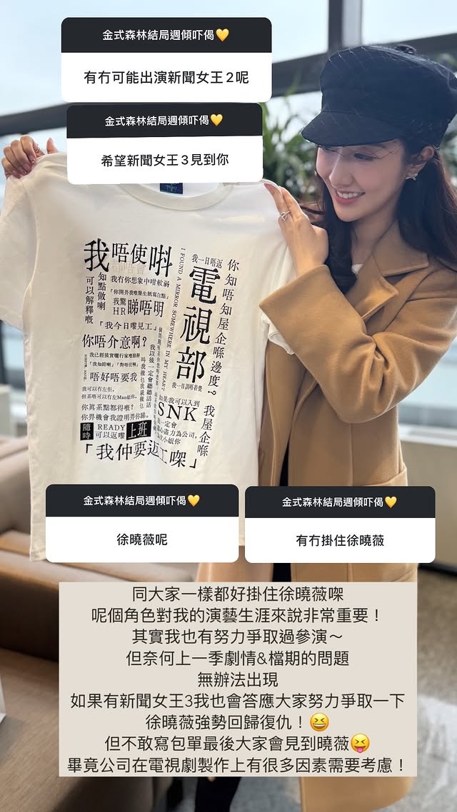 面對大量網民追問「徐曉薇呢」、「有冇可能出演新聞女王2呢」,何依婷在IG Story中統一回應。她首先表示:「同大家一樣都好掛住徐曉薇㗎,呢個角色對我的演藝生涯來說非常重要!」