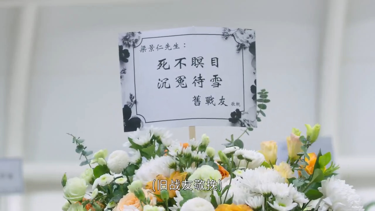 追思會上有人以「老戰友」的名字送上了「死不瞑目 沉冤待雪」的花牌到現場。(影片截圖)