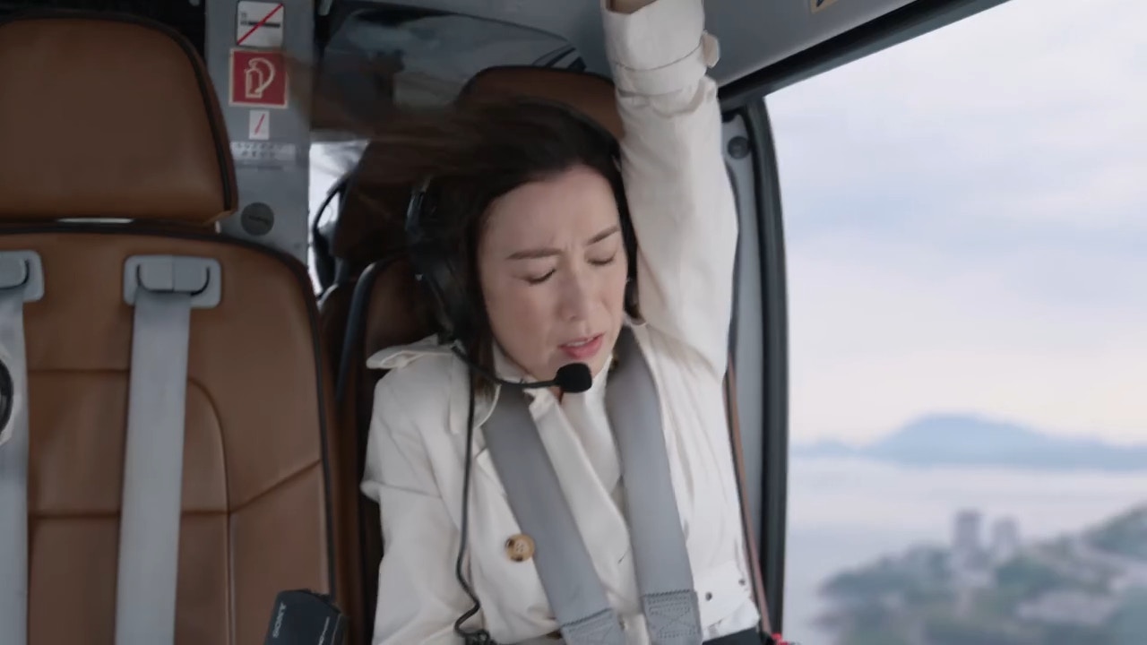 佘詩曼坐在直昇機中以高空角度開直播為大家報道現場實況。(影片截圖)