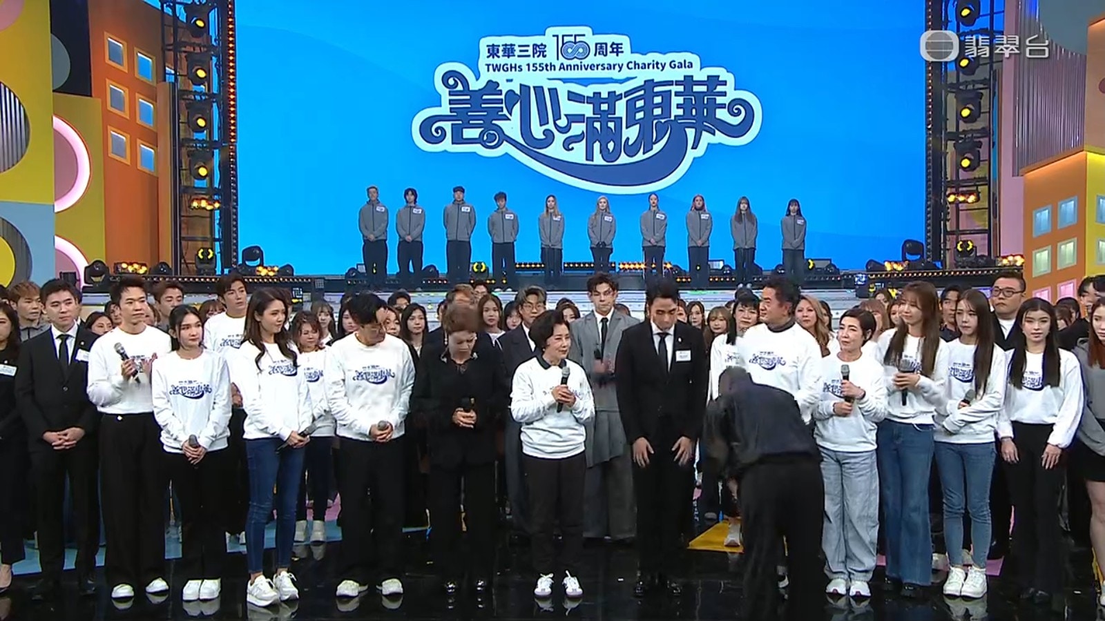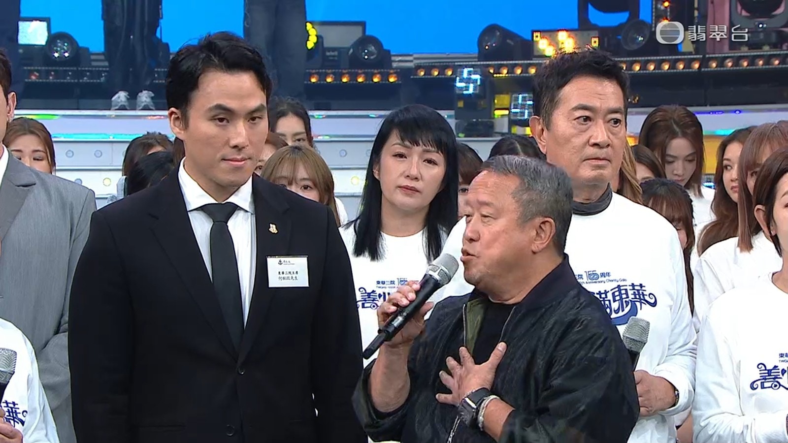 TVB總經理曾志偉向東華主席及一眾出力藝人鞠躬致謝。(電視截圖)