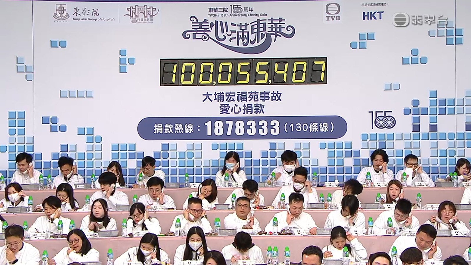 年度大型籌款節目《善心滿東華》今(29日)晚假將軍澳電視廣播城舉行,晚間新聞報導前,善款數字達$9,7055,407,無綫總經理曾志偉在大合唱後現身,表示要感激東華主席何猷啟及多位董事,並希望略盡綿力,與某公司合共捐出300萬港元,將善款數字推高到1億,總數為$100,055,407。
